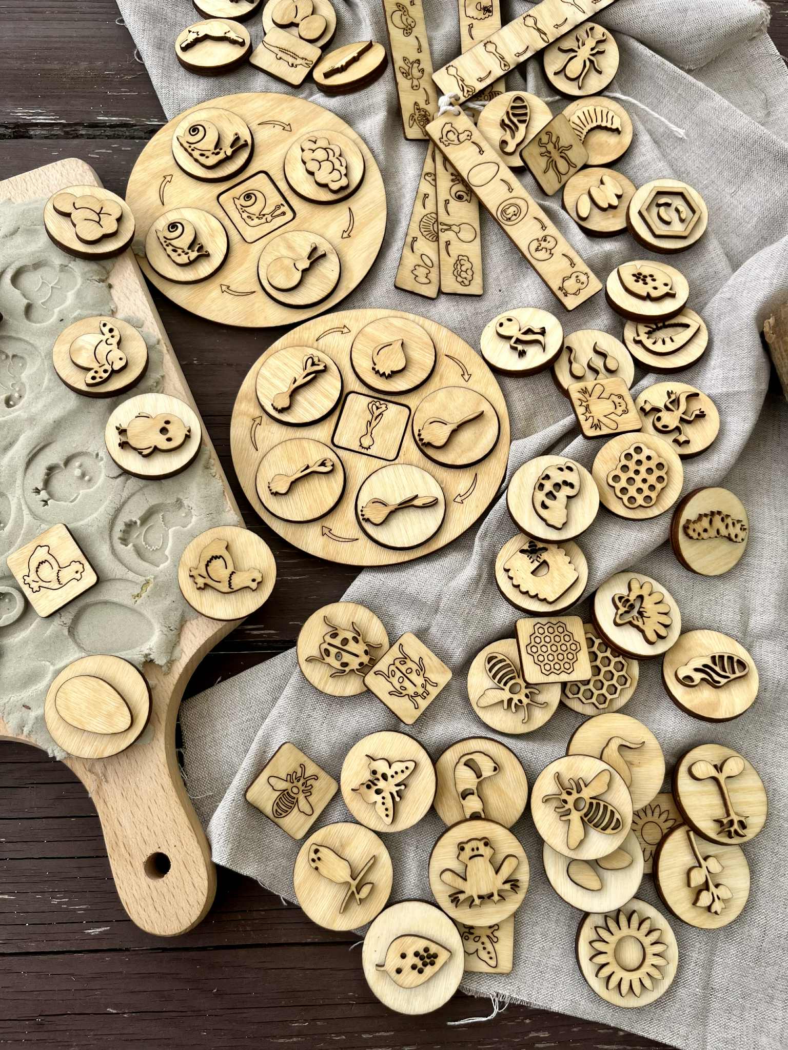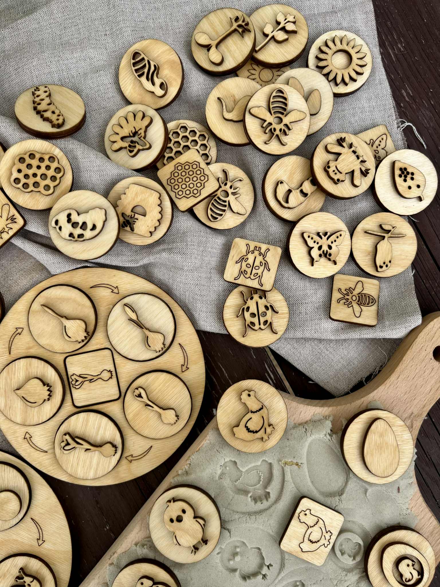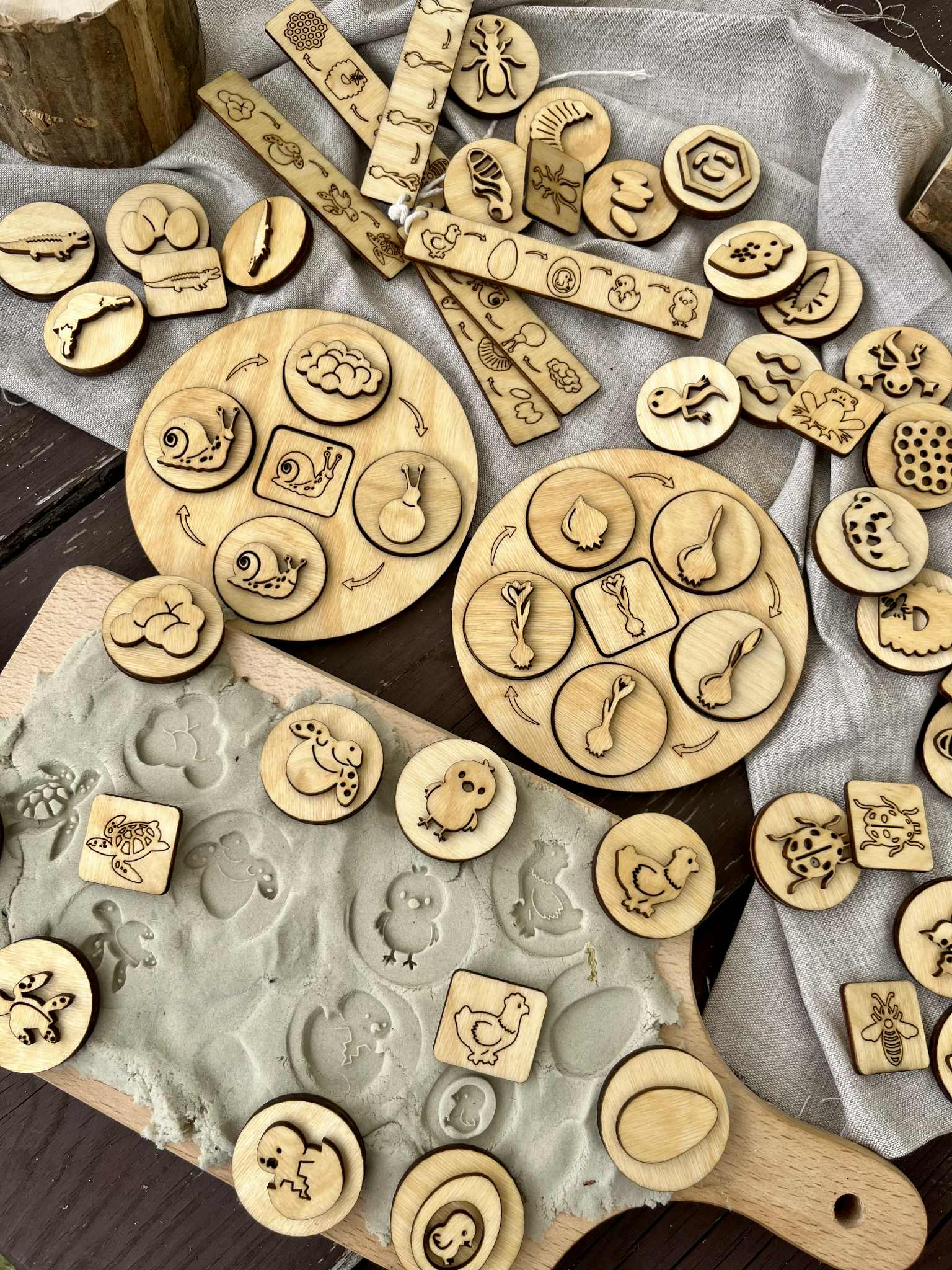Drewniane Okrągłe Tace Cykle Rozwojowe. Zestaw zawiera 12 różnych cykli rozwojowych :mrówki, żółwia,krokusa,kury, ślimaka,krokodyla, pszczoły, miodu, motyla, żaby, biedronki, słonecznika. W zestawie znajdziecie 52 dwustronne stemple do odbijania w ciastolinie i piasku kinetycznym. Ta pomoc dydaktyczna pomaga dzieciom zrozumieć procesy zachodzących w naturze. Dzieci przez zabawę uczą się o otaczającym ich świecie. Wszystkie drewniane elementy są olejowane naturalnym olejem lnianym.