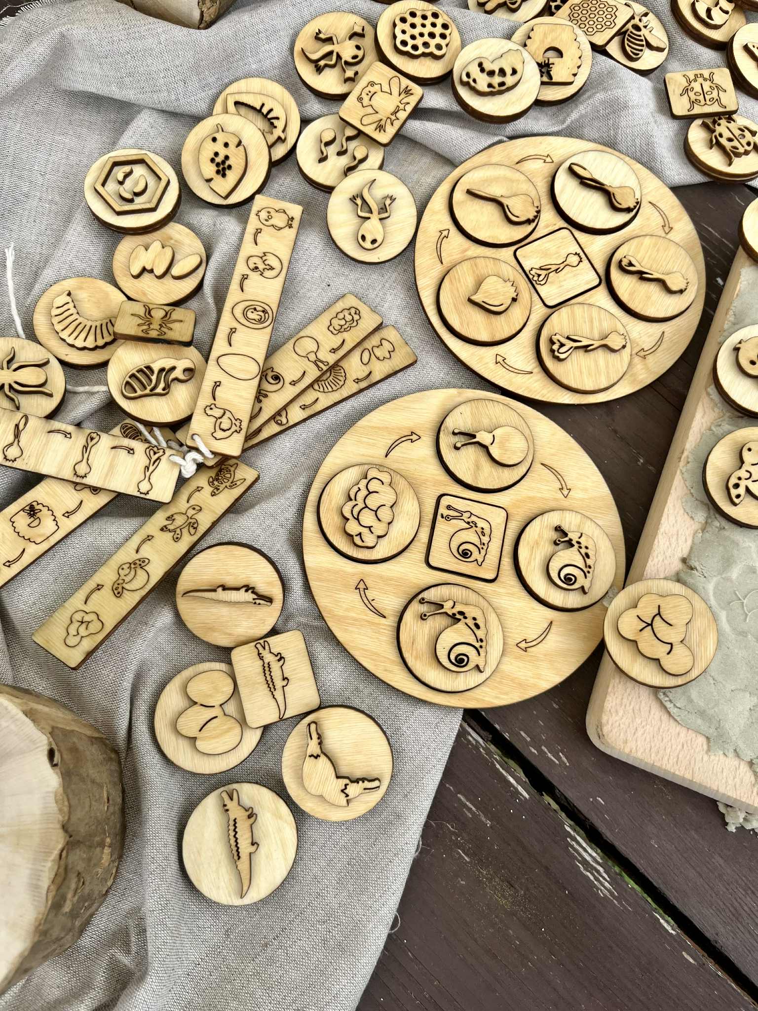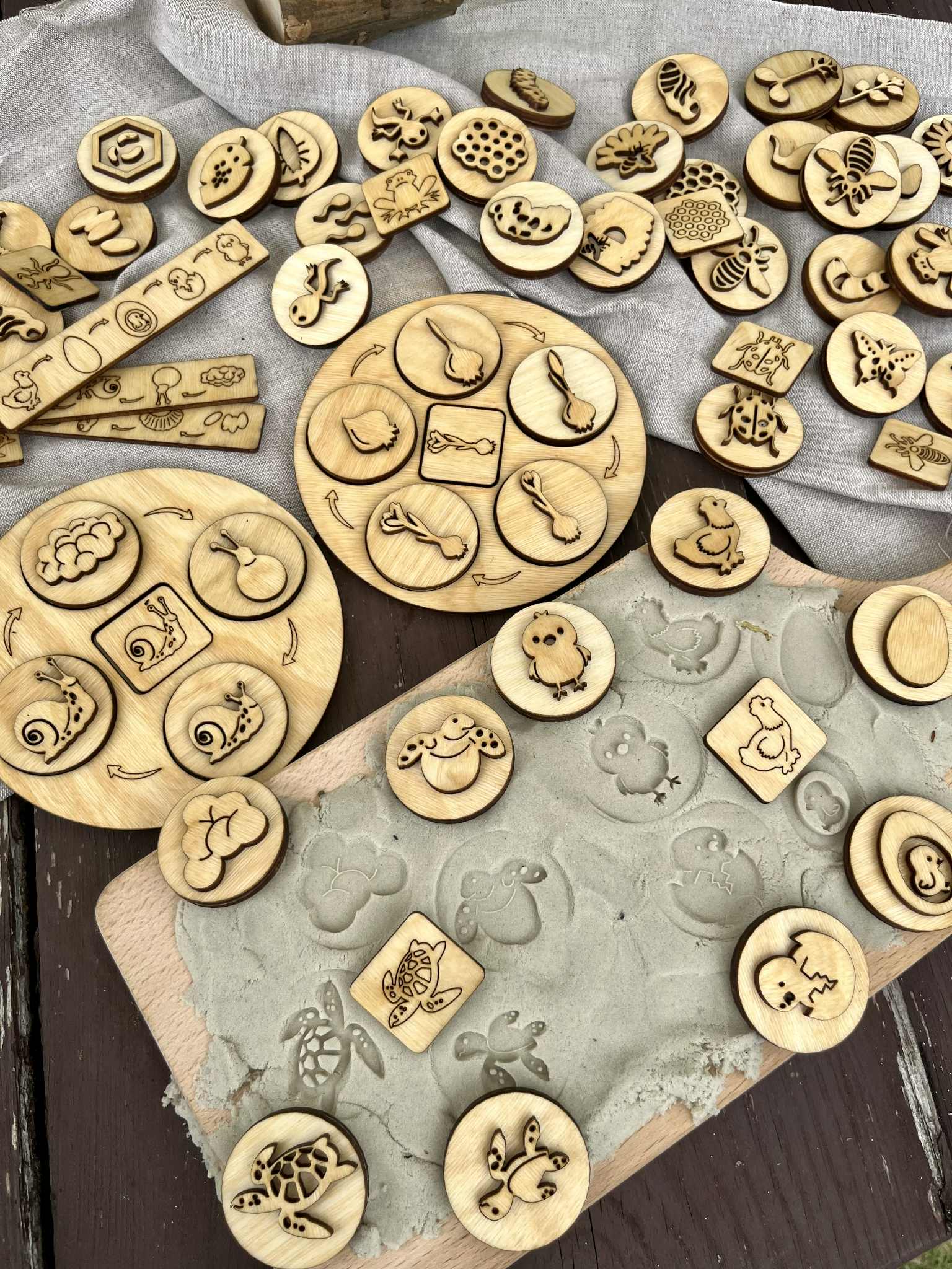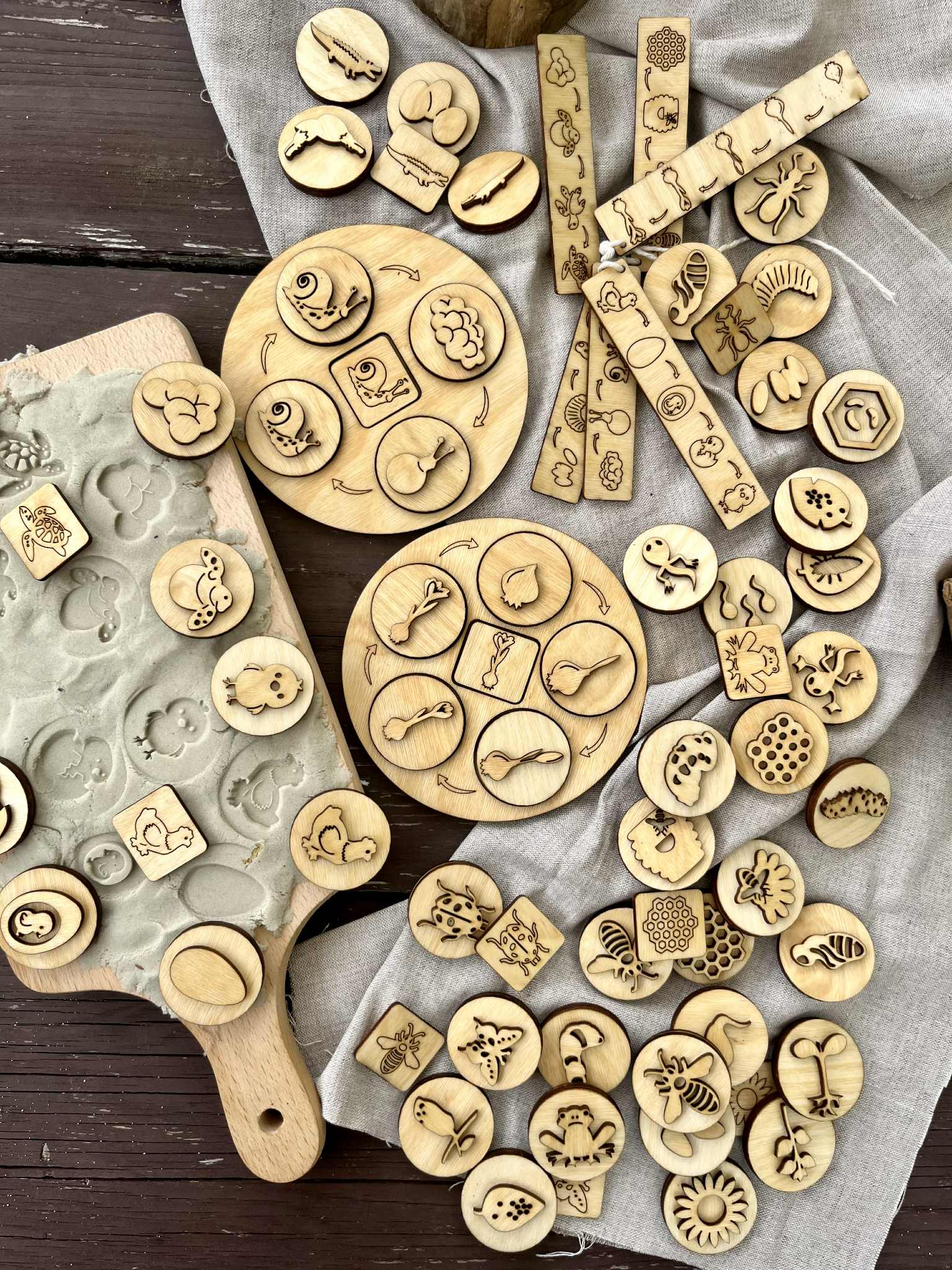 Drewniane Okrągłe Tace Cykle Rozwojowe. Zestaw zawiera 12 różnych cykli rozwojowych :mrówki, żółwia,krokusa,kury, ślimaka,krokodyla, pszczoły, miodu, motyla, żaby, biedronki, słonecznika. W zestawie znajdziecie 52 dwustronne stemple do odbijania w ciastolinie i piasku kinetycznym. Ta pomoc dydaktyczna pomaga dzieciom zrozumieć procesy zachodzących w naturze. Dzieci przez zabawę uczą się o otaczającym ich świecie. Wszystkie drewniane elementy są olejowane naturalnym olejem lnianym.