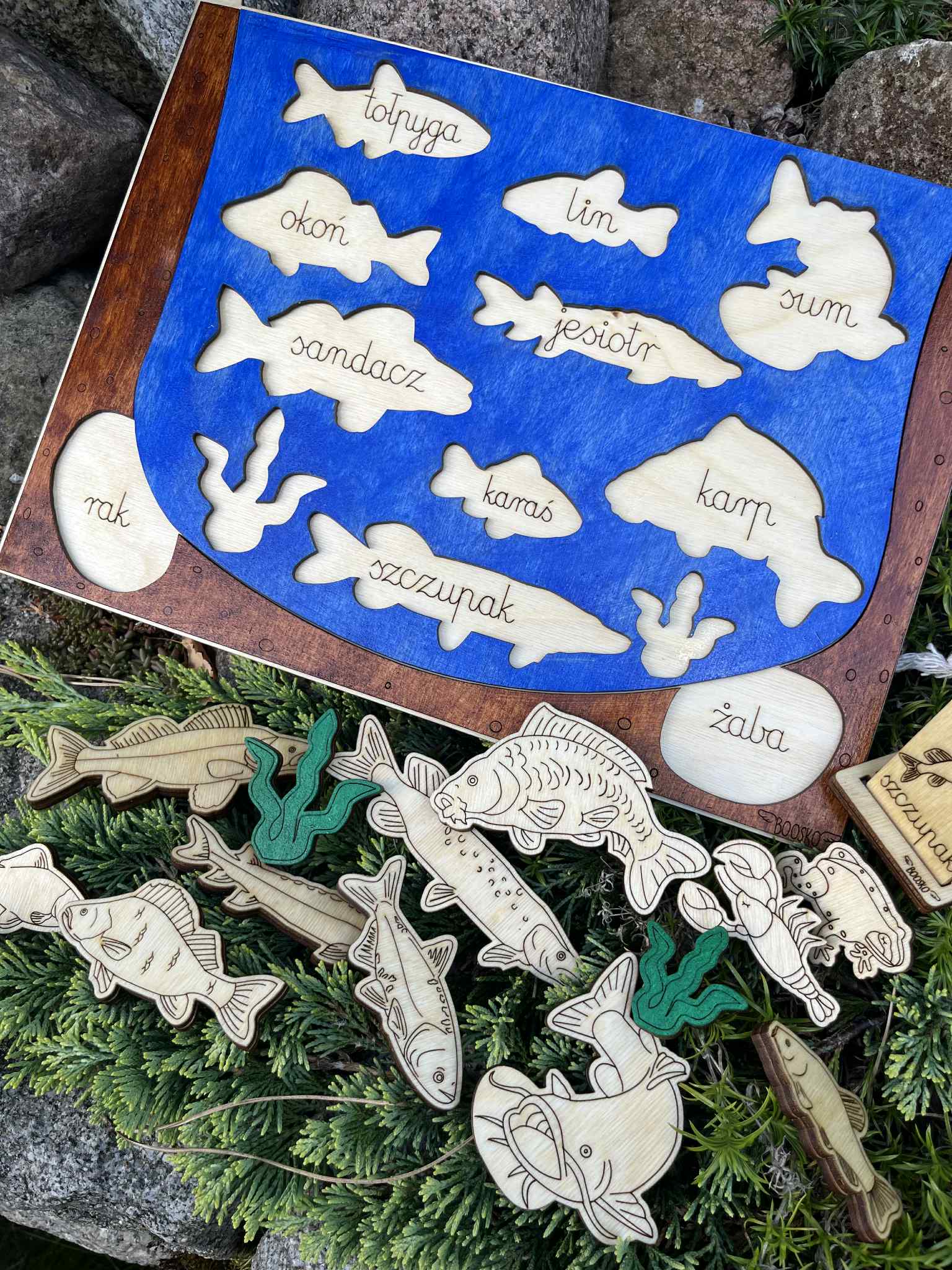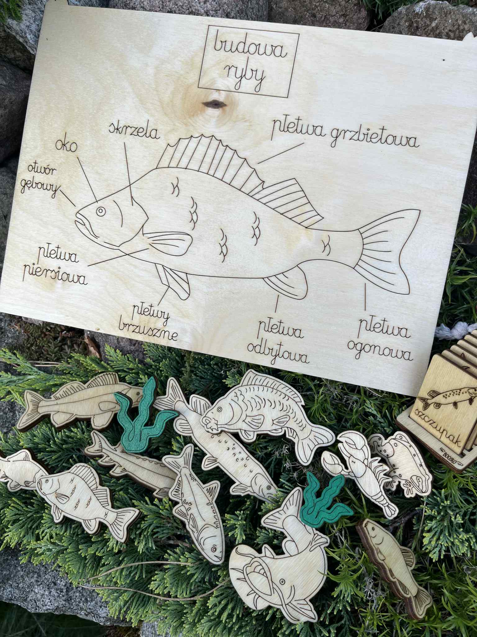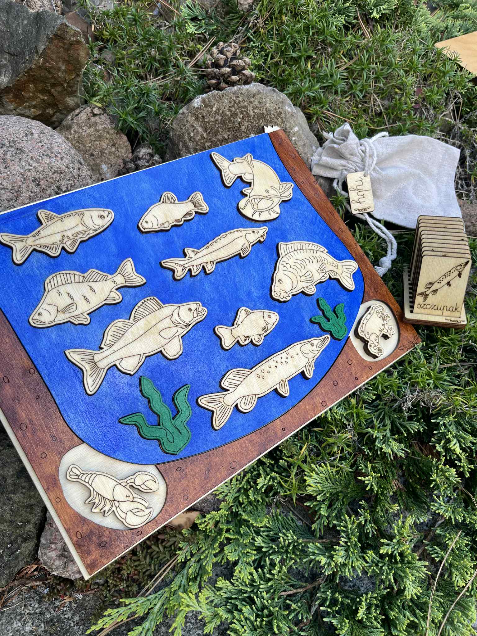 • Drewnianą układankę z wyjmowanymi rybami – każda ryba idealnie pasuje do swojego miejsca. Pod rybą znajduje się jej nazwa. Na odwrocie układanki znajduje się ilustracja budowy ryby, która pomoże poznać jej anatomię.