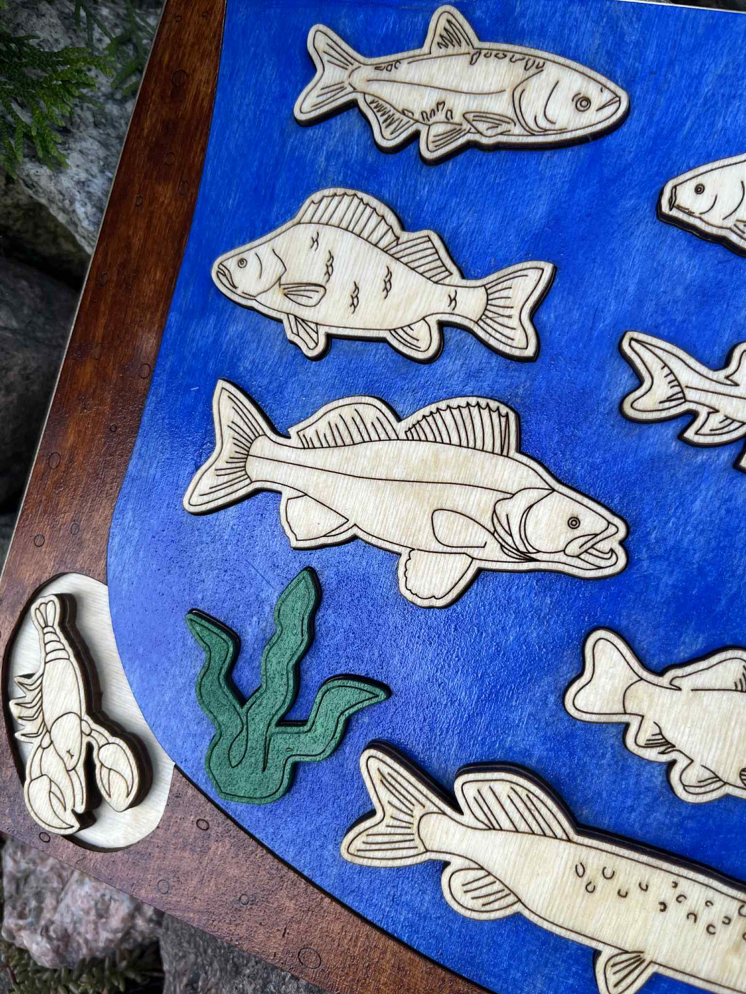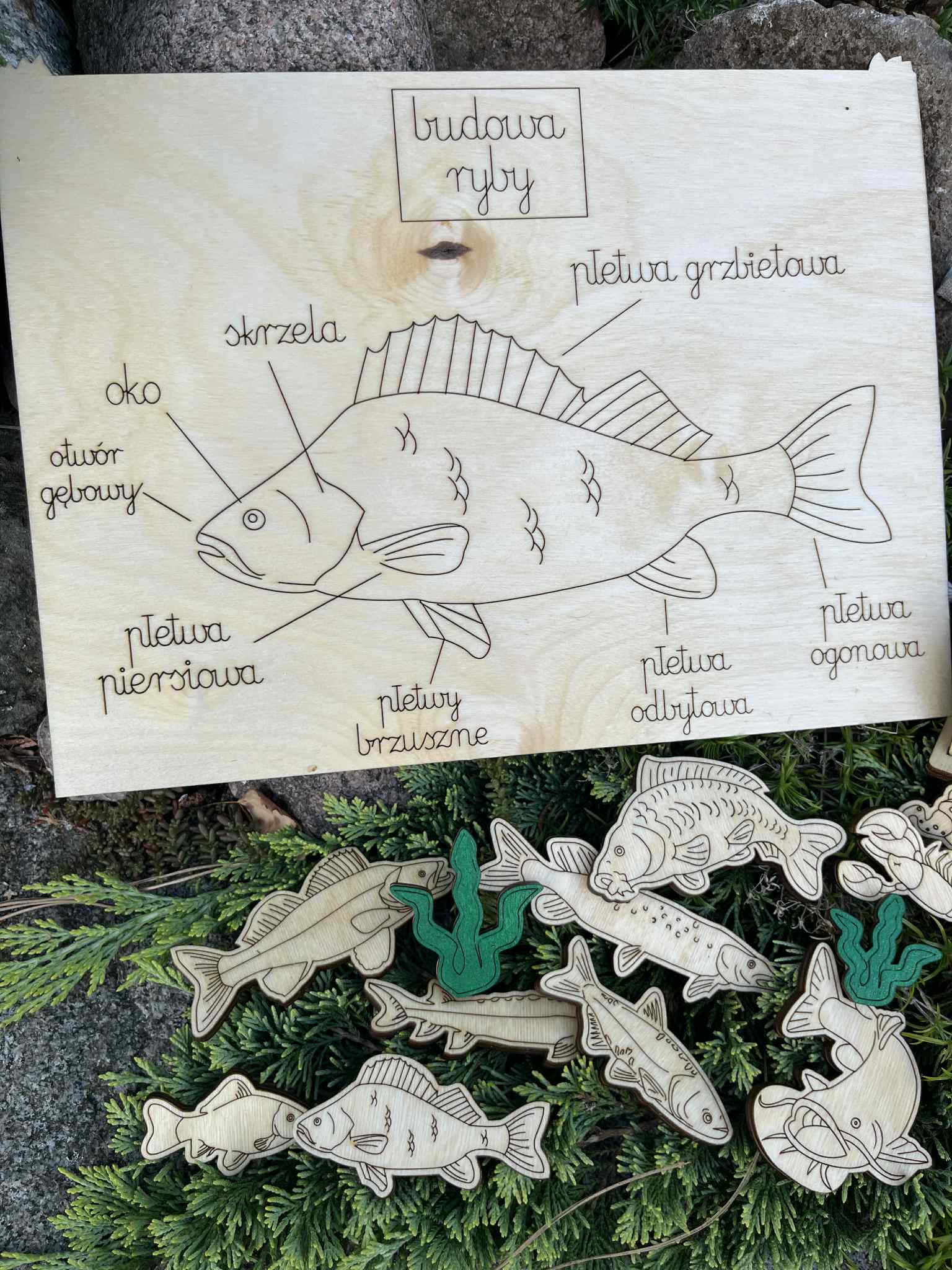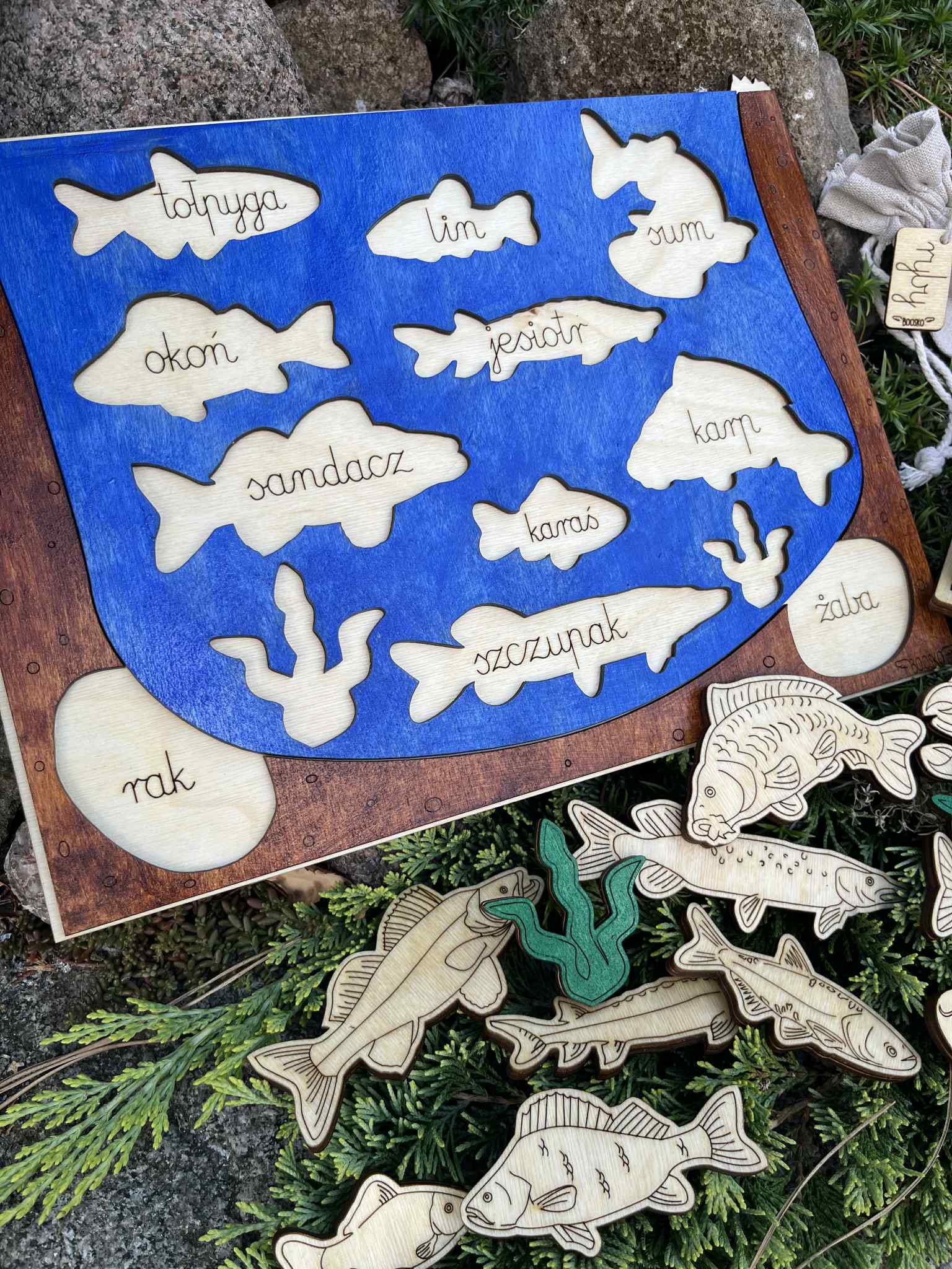 • Drewnianą układankę z wyjmowanymi rybami – każda ryba idealnie pasuje do swojego miejsca. Pod rybą znajduje się jej nazwa. Na odwrocie układanki znajduje się ilustracja budowy ryby, która pomoże poznać jej anatomię.