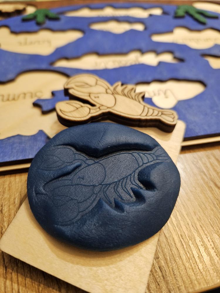 • Drewniane karty z wizerunkiem polskich ryb – na odwrocie każdej karty znajduje się stempel do odciskania w ciastolinie, co rozwija wyobraźnię i kreatywność dziecka.