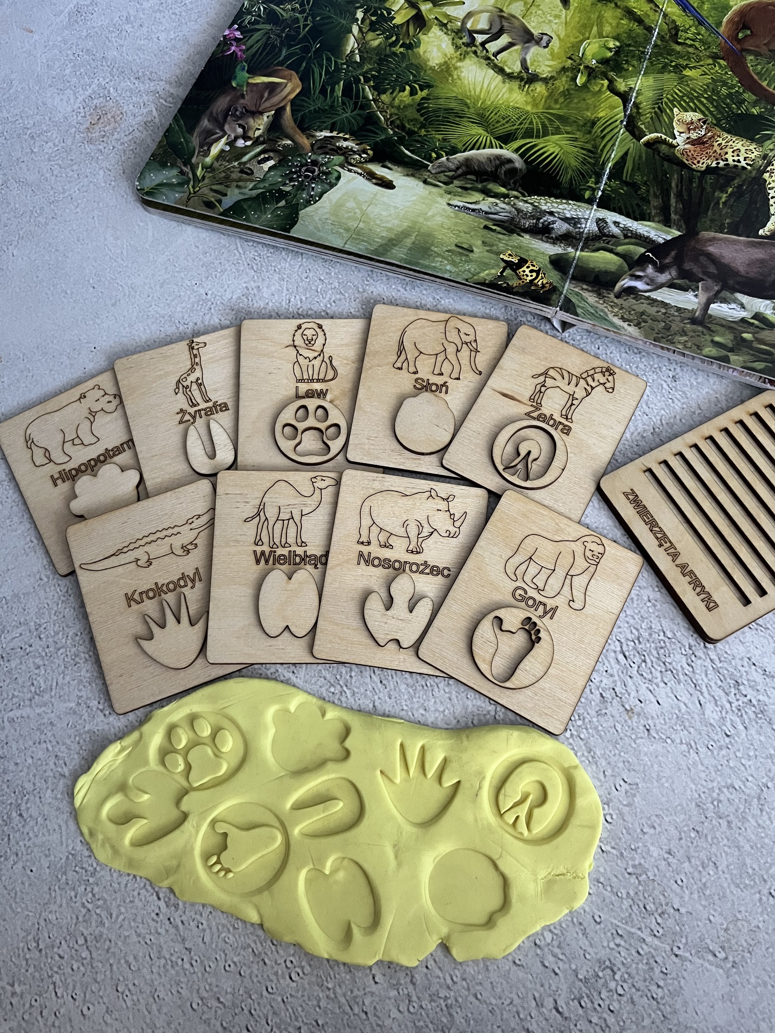 Drewniane karty „Tropy zwierząt ” do odbijania w ciastolinie i piasku kinetycznym.