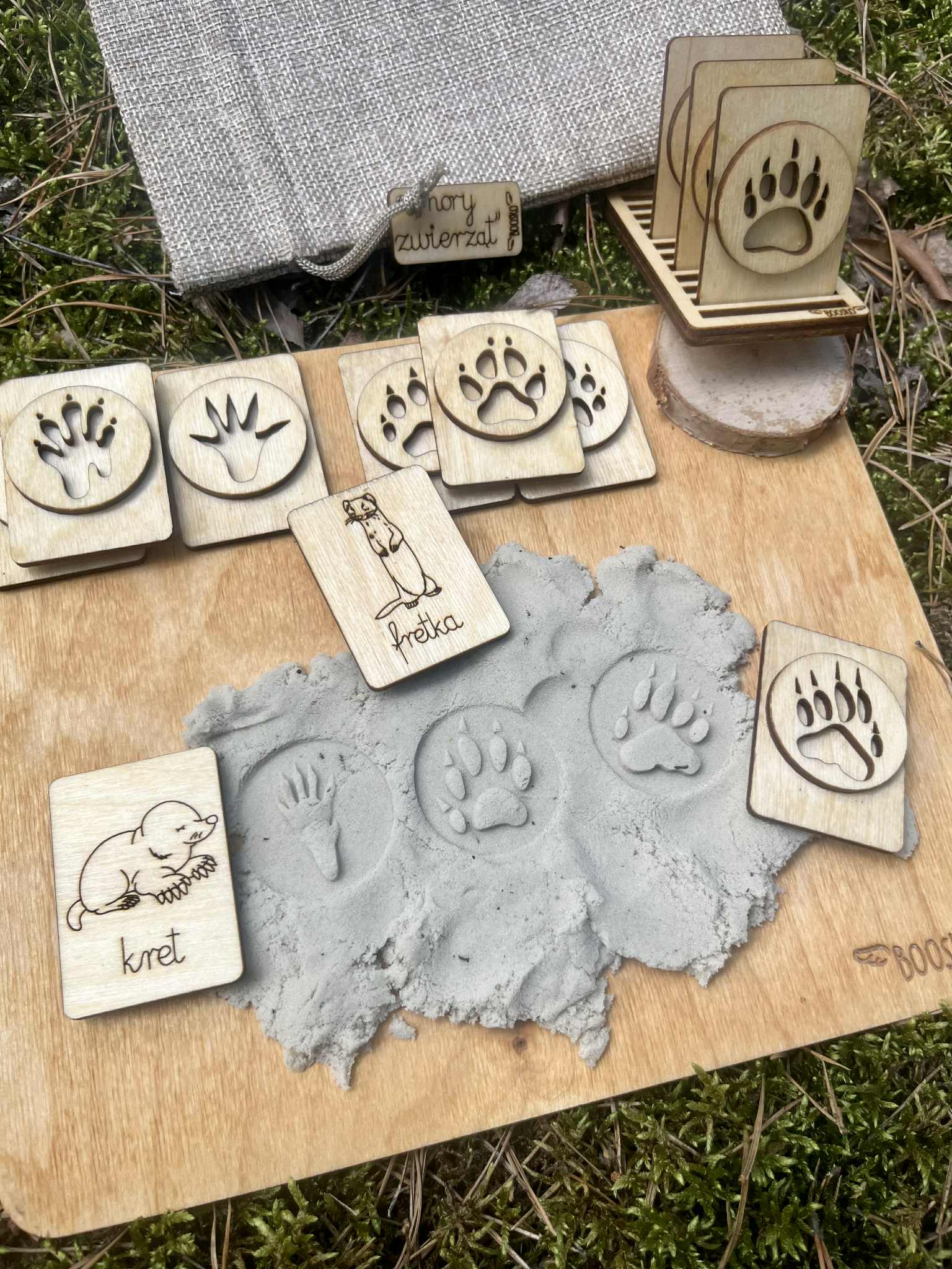 - Zestaw kart z tropami (12szt.). Każda karta przedstawia zwierzę, a na odwrocie znajduje się jego odcisk łapy, który można odbijać w  ciastolinie. To świetna zabawa sensoryczna i nauka rozpoznawania śladów dzikich zwierząt.
