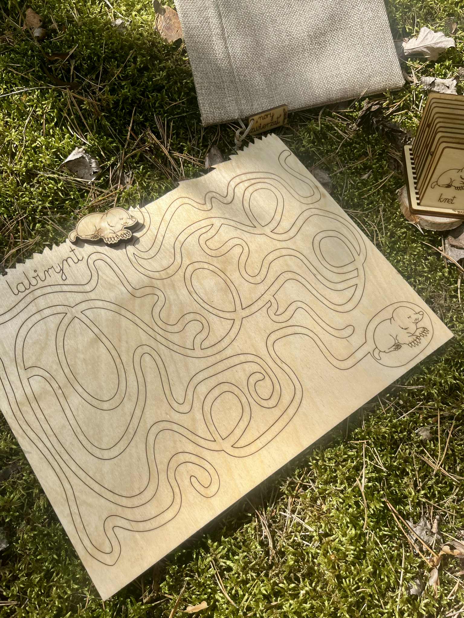 -Drewniana układanka – Nory zwierząt W zestawie znajduje się plansza z norami i dopasowanymi do nich drewnianymi figurkami zwierząt – takich jak lis, borsuk, jeż, królik, kret, wydra, łasica czy fretka. Na odwrocie planszy czeka labirynt z misją: pomóż kretowi dotrzeć do swojej nory!