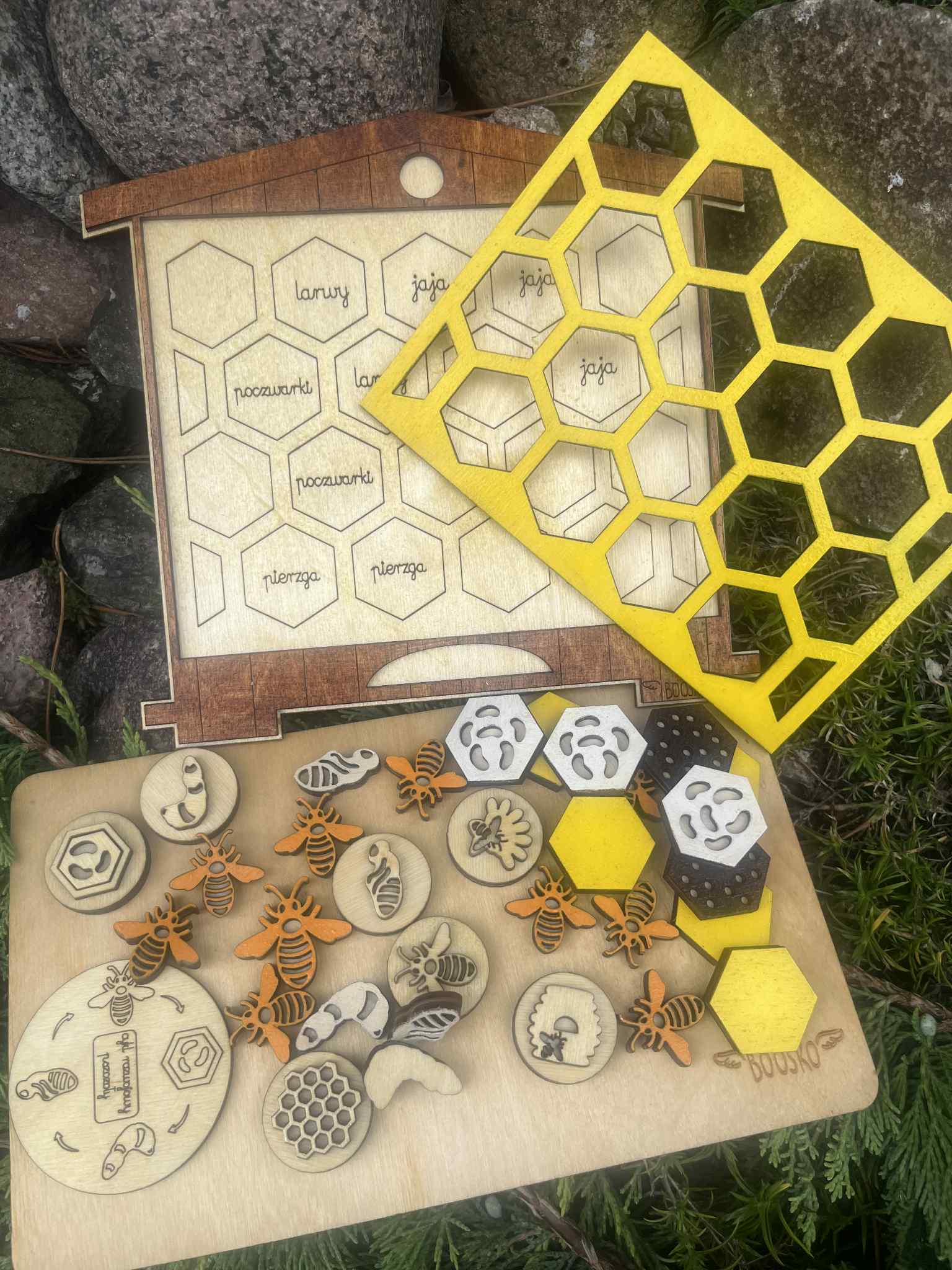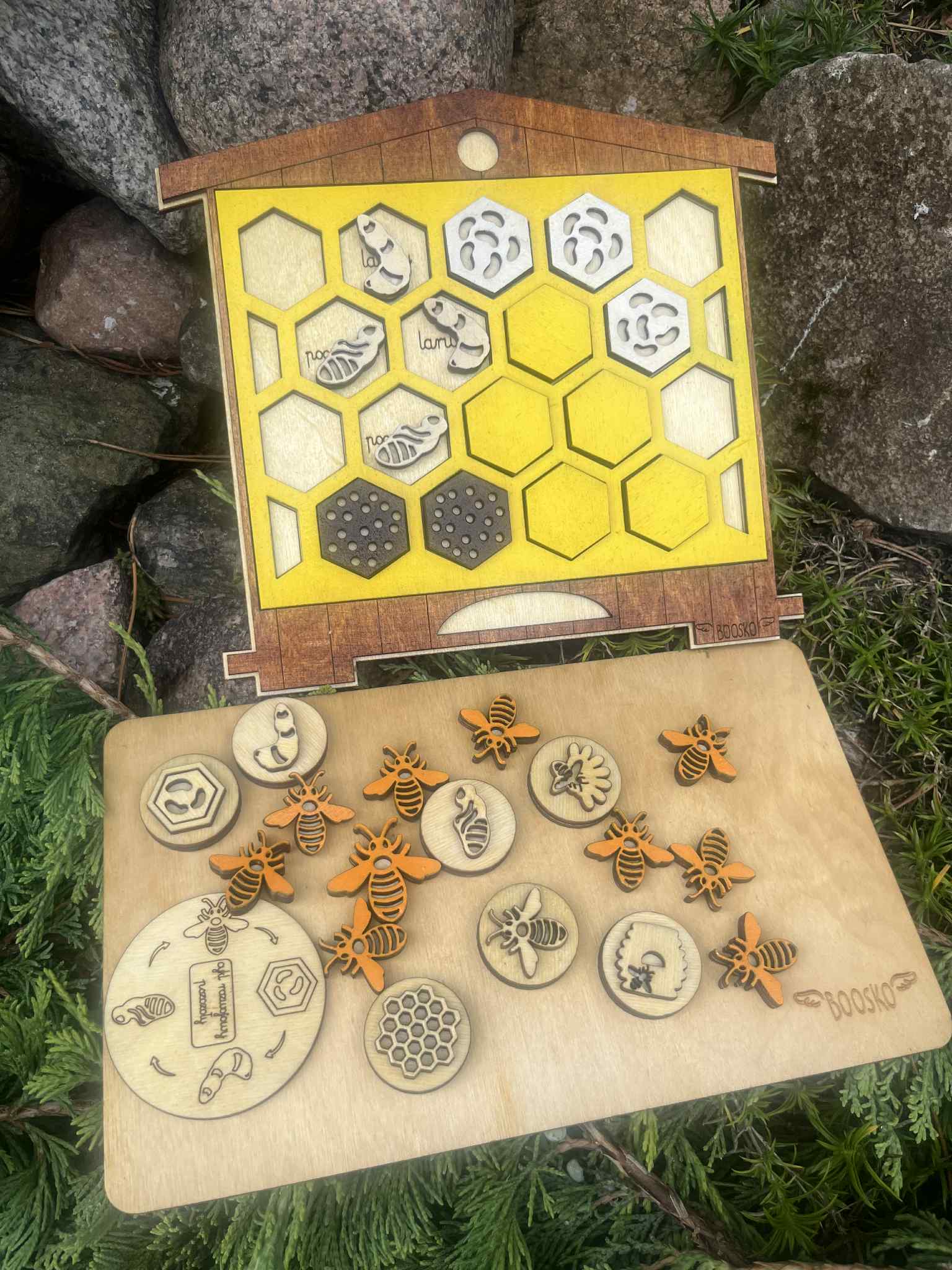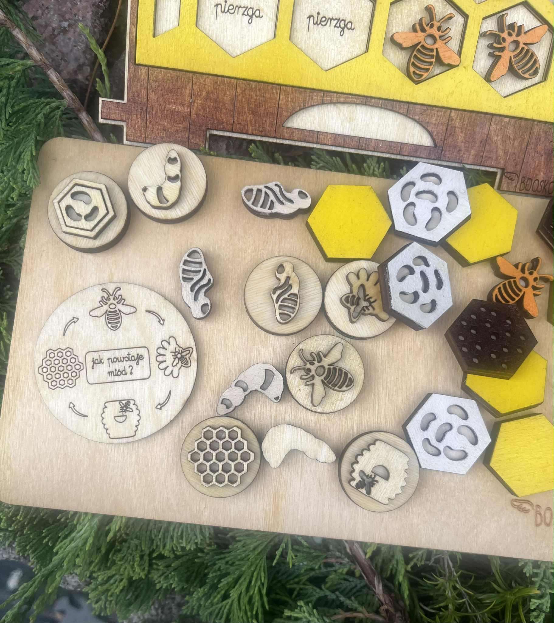 Dlaczego warto? ???? Naturalne materiały – ul wykonany ze  sklejki brzozowej, bezpieczny dla dzieci. ???? Edukacyjna zabawa – uczy dzieci ekologii, biologii oraz znaczenia pszczół w przyrodzie. ????️ Rozwija motorykę i wyobraźnię – dzięki wyjmowanym elementom i zabawie stemplem w ciastolinie. To doskonały pomysł na prezent dla małych odkrywców i przyszłych przyjaciół pszczół!