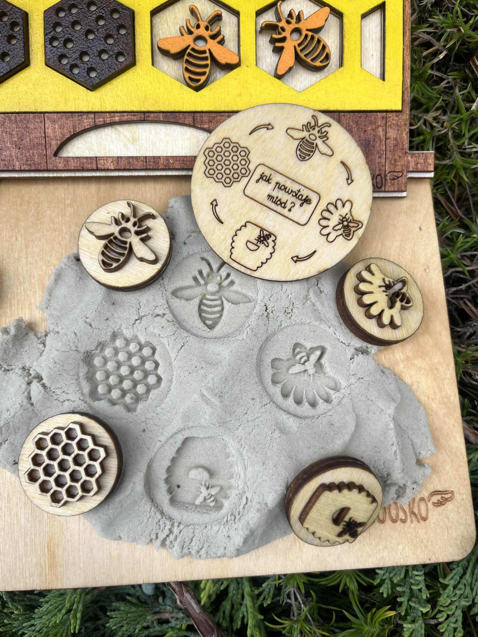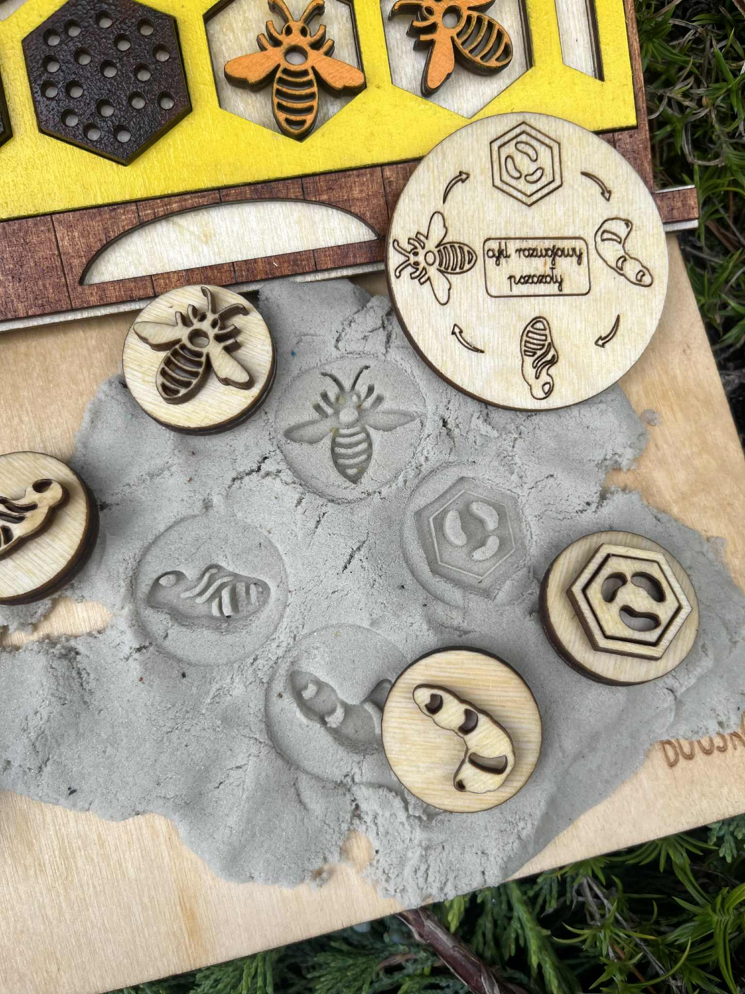 - Stemple do ciastoliny – zestaw zawiera stemple przedstawiające cykl rozwojowy pszczoły (jajo → larwa → poczwarka → dorosła pszczoła)