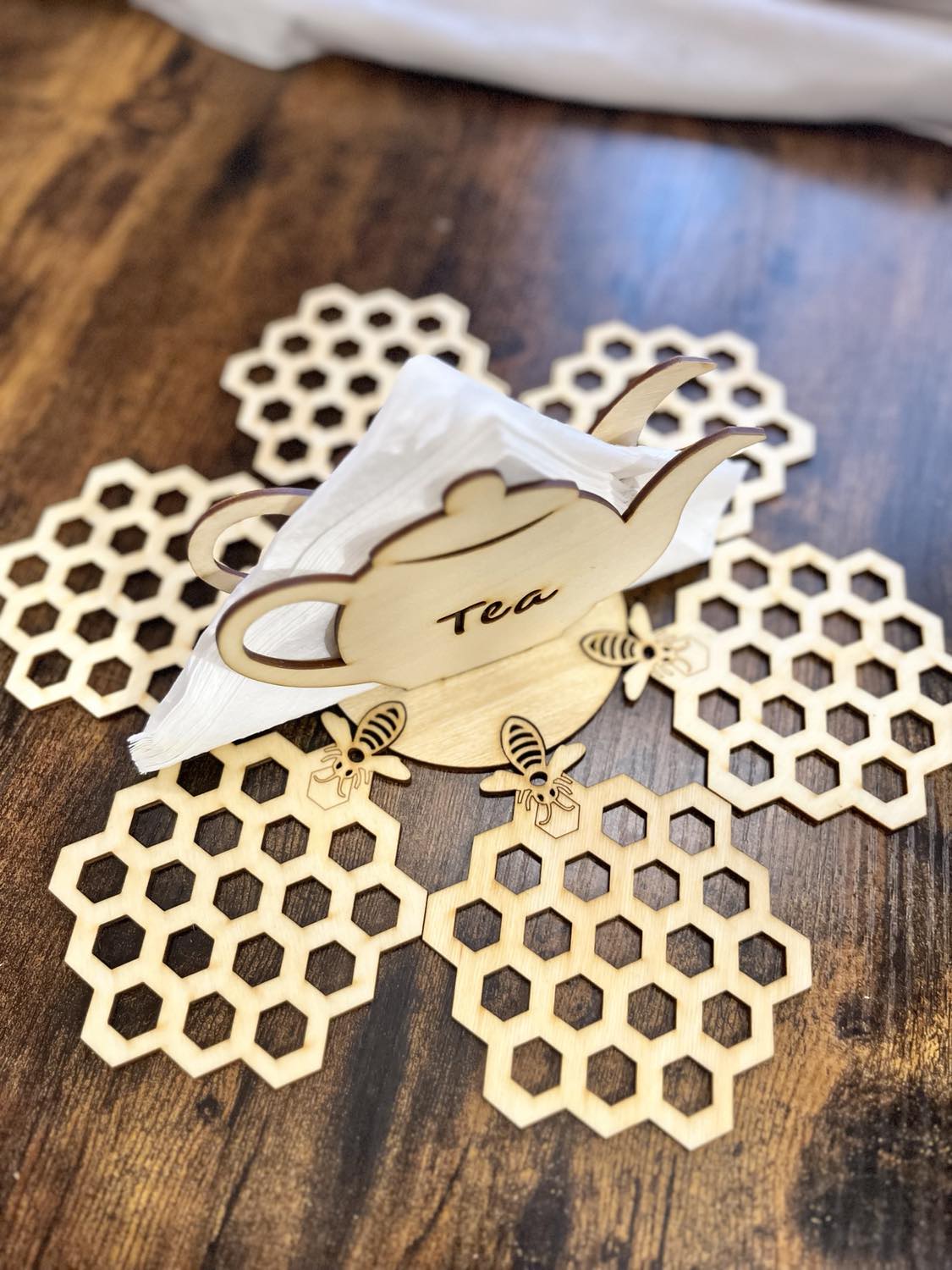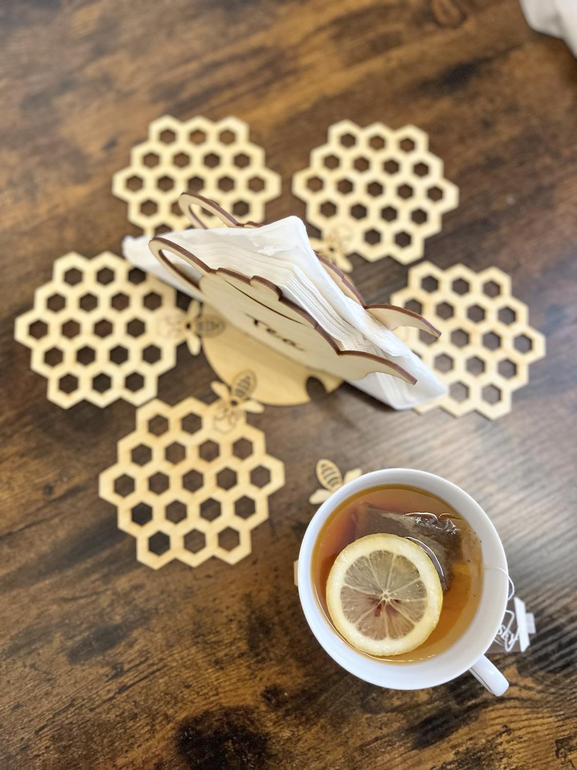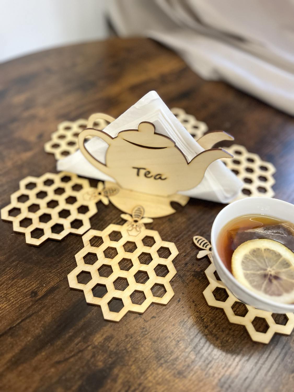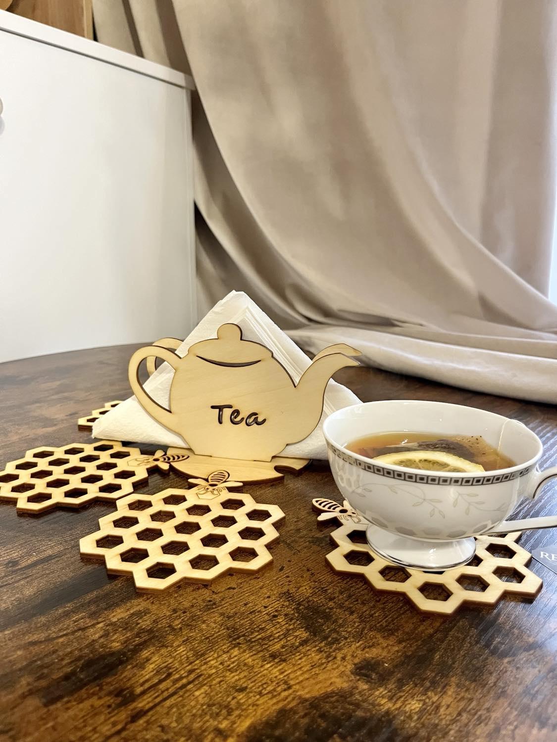 -Drewniany serwetnik +6 podkładek pod kubek