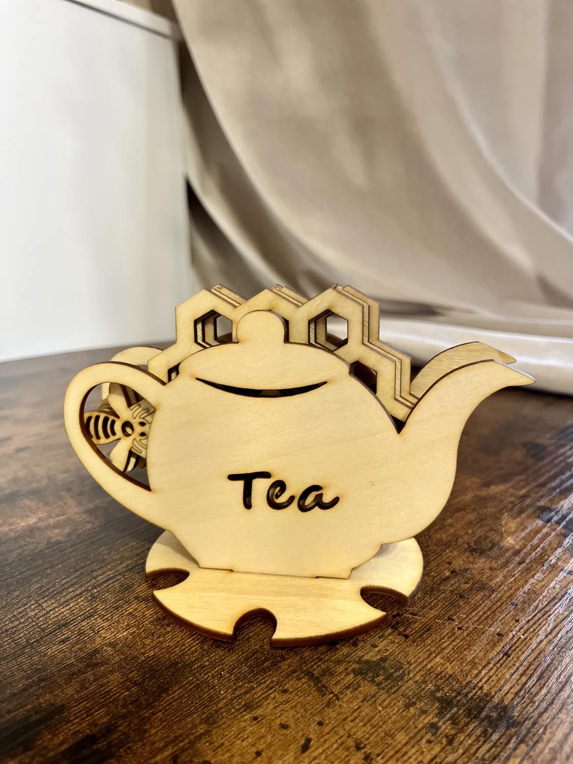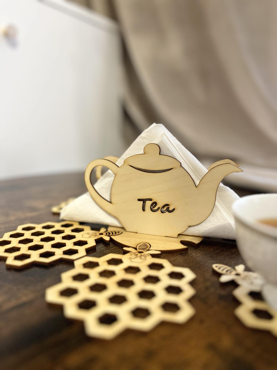 Drewniane elementy wykonane ze sklejki brzozowej 3mm, zaolejowane naturalnym olejem lnianym.