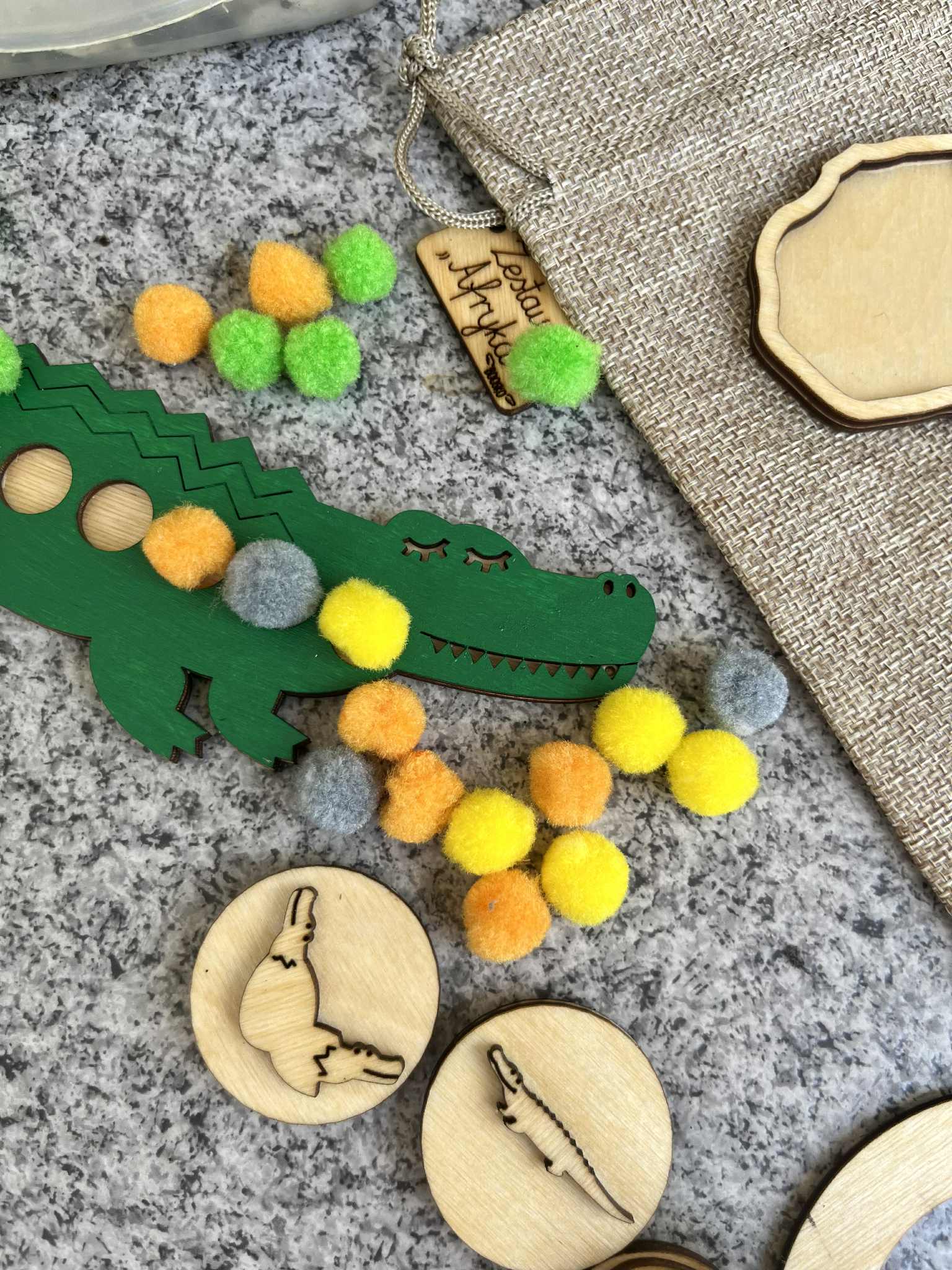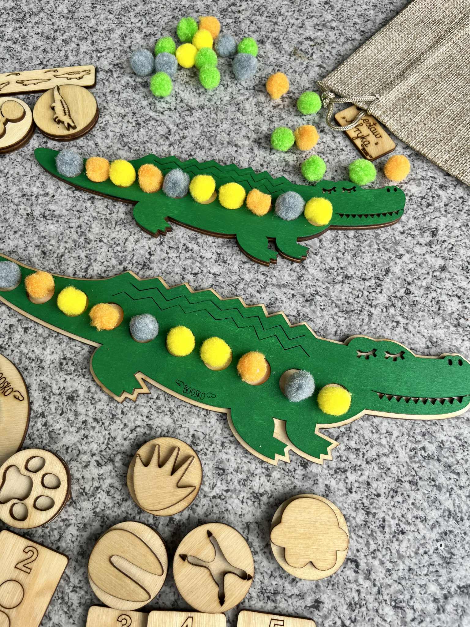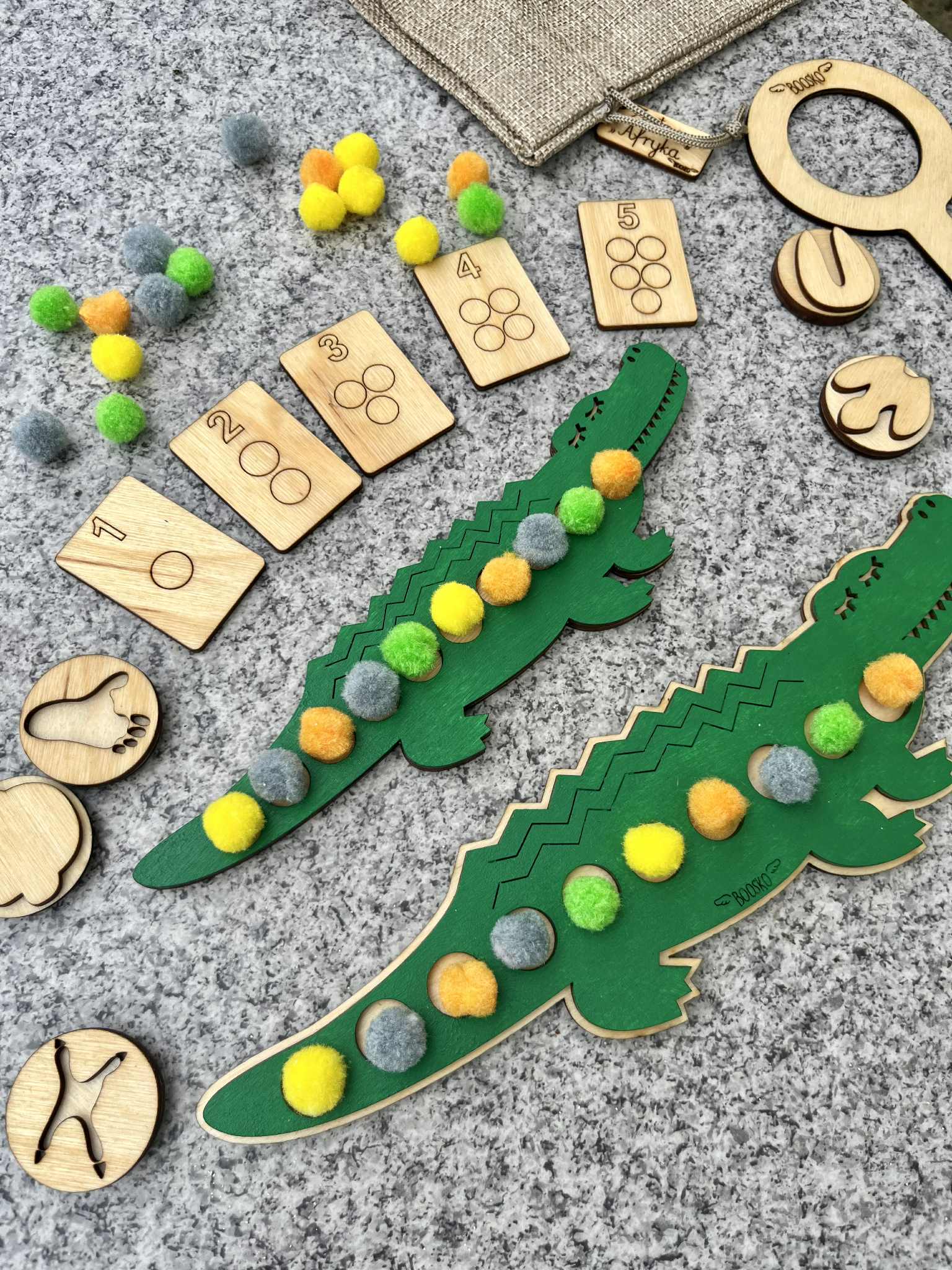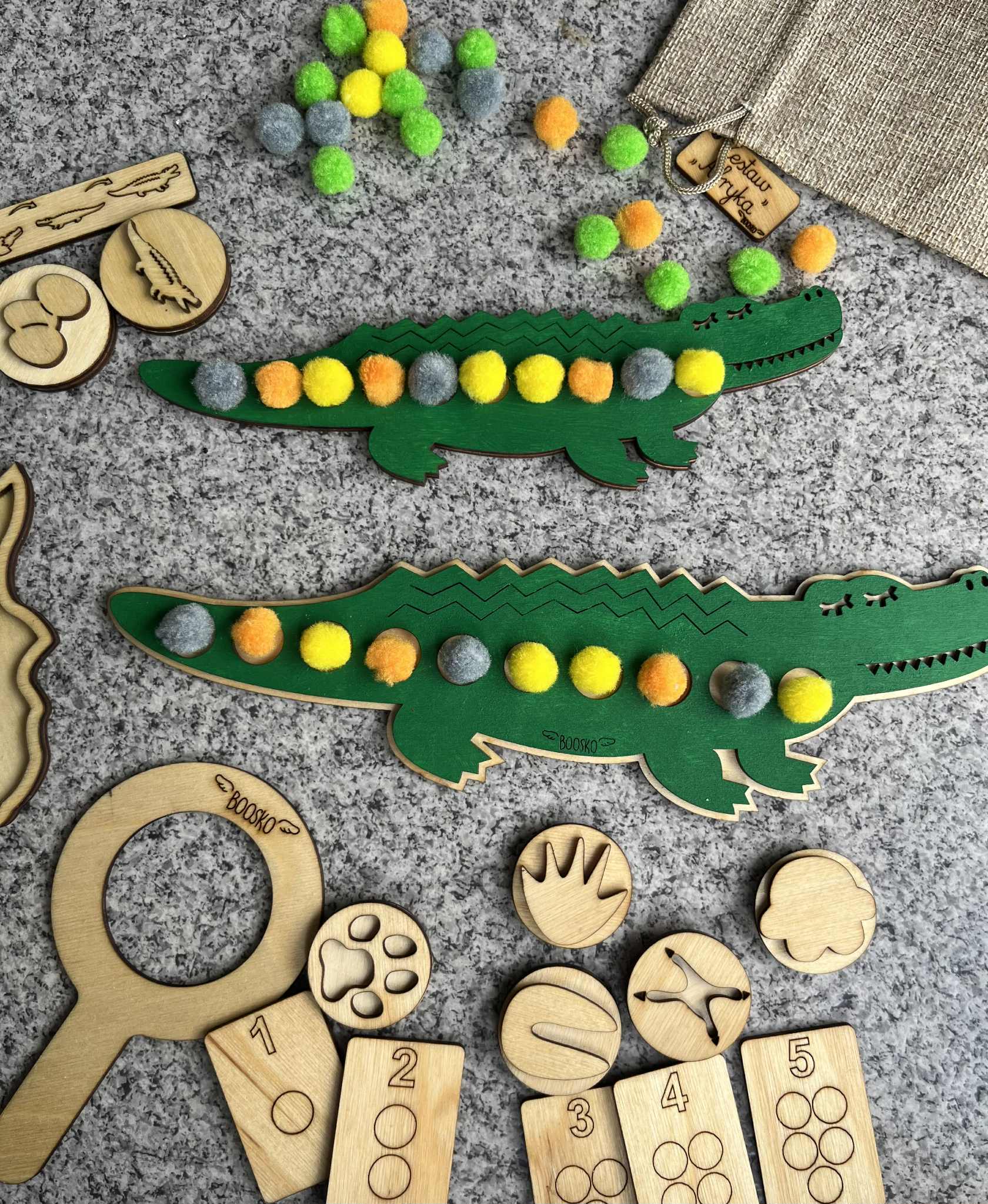 Poznaj wyjątkowy zestaw edukacyjny stworzony z myślą o wspieraniu rozwoju logicznego myślenia, motoryki małej i koordynacji wzrokowo-ruchowej u dzieci. W zestawie znajdziesz dwa drewniane Krokodyle, które kryją w sobie wiele kreatywnych możliwości! ???? Układanka lewopółkulowa – na grzbiecie większego krokodyla znajduje się miejsce do układania pomponów które trzeba ułożyć według wzoru lub koloru ułożonego na małym krokodylu. Zabawa wspiera sekwencjonowanie, analizę wzrokową i koncentrację. ???? Drewniane stemple z motywem tropów zwierzaków mieszkających w Afryce – idealne do zabaw z ciastoliną . Rozwijają sprawność manualną i wyobraźnię.  ???? Dwustronne Kafelki z cyframi 1–10 – można je wykorzystywać do liczenia pomponów, nauki cyfr czy prostych działań matematycznych. ???? ???? Zestaw idealny do zabawy w domu, przedszkolu, terapii oraz zajęć Montessori.