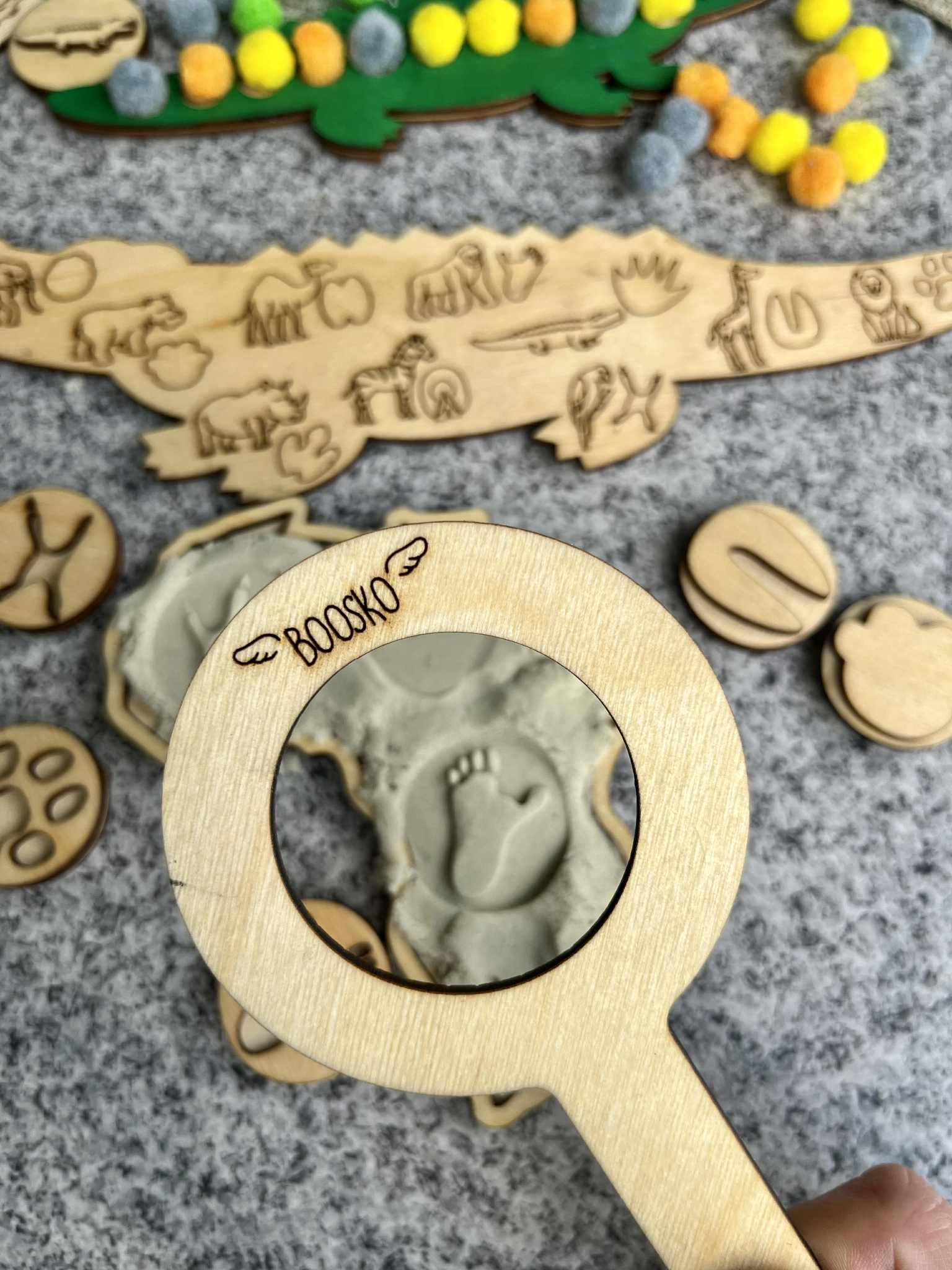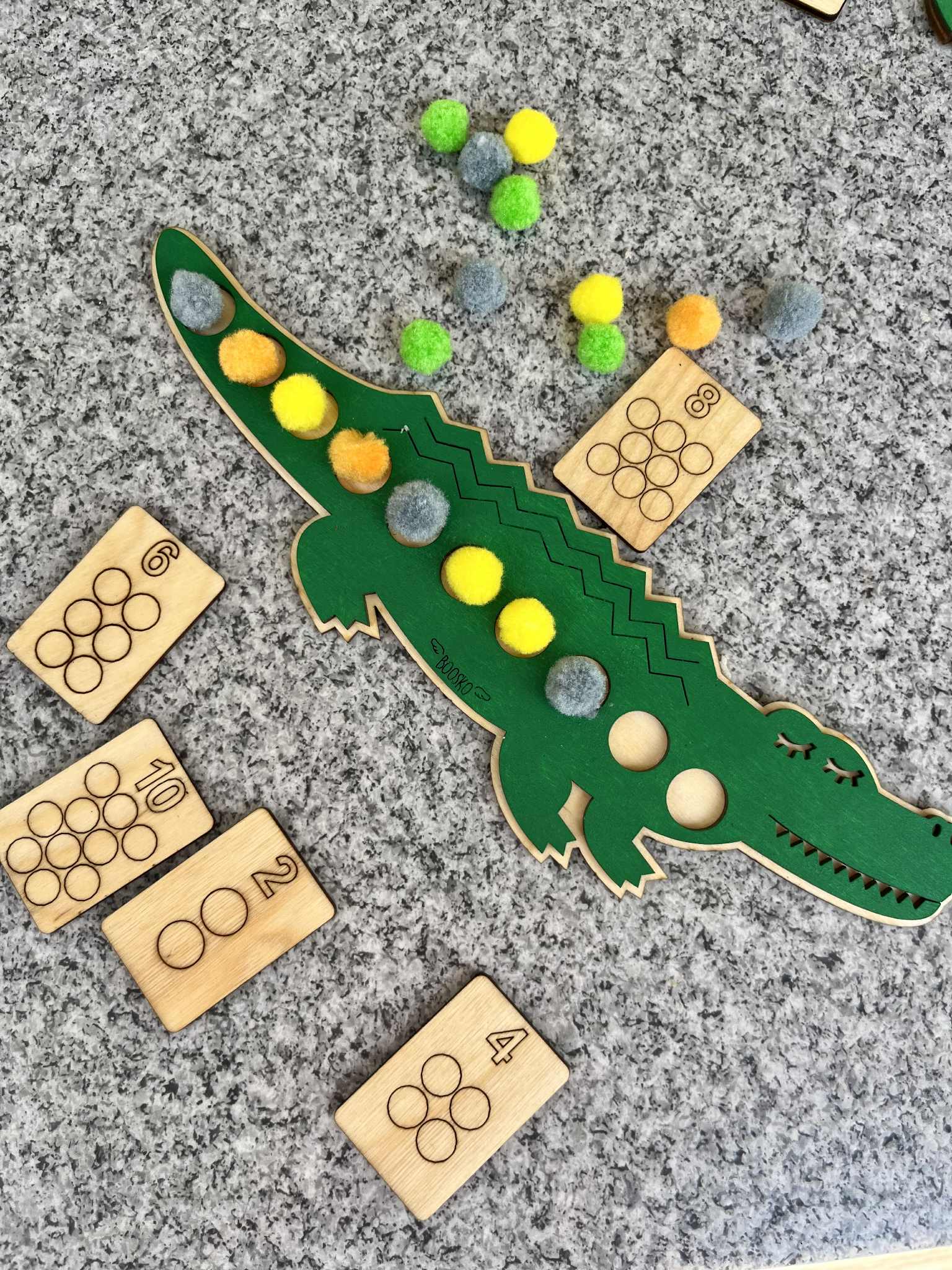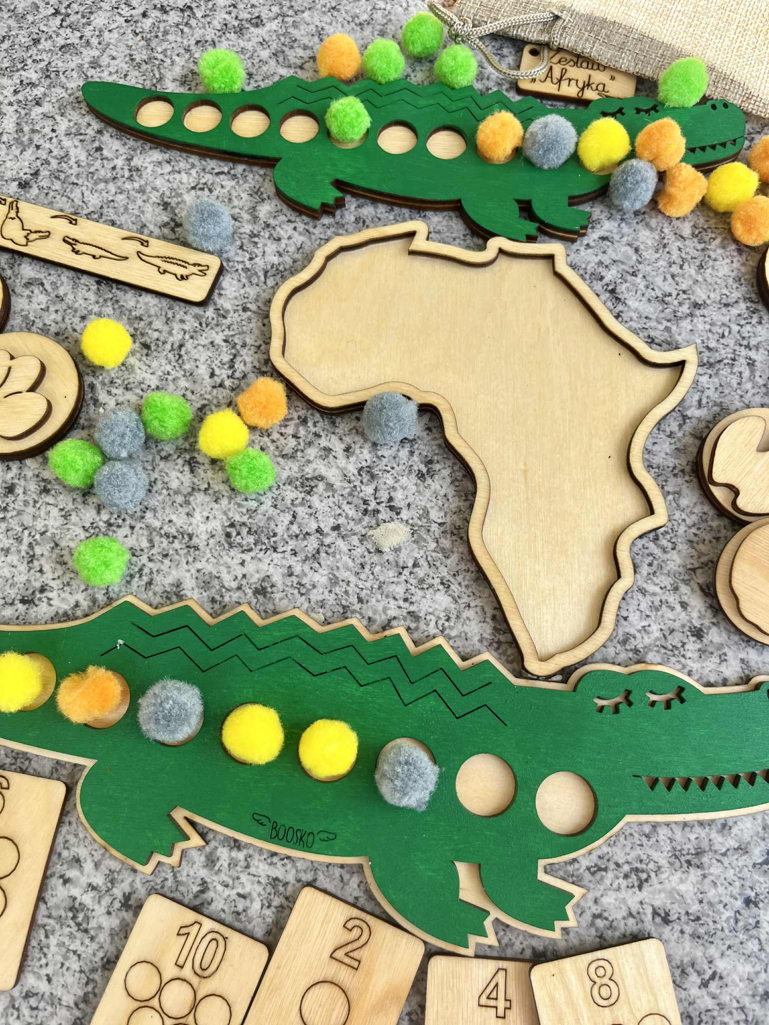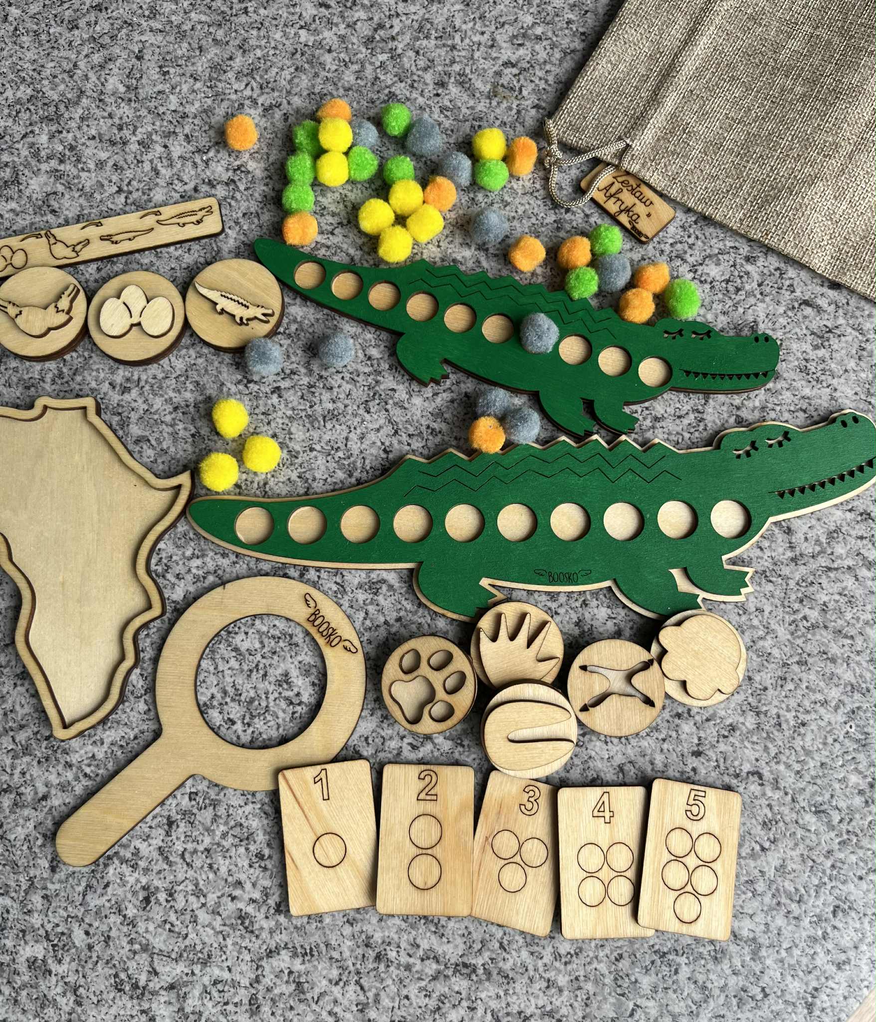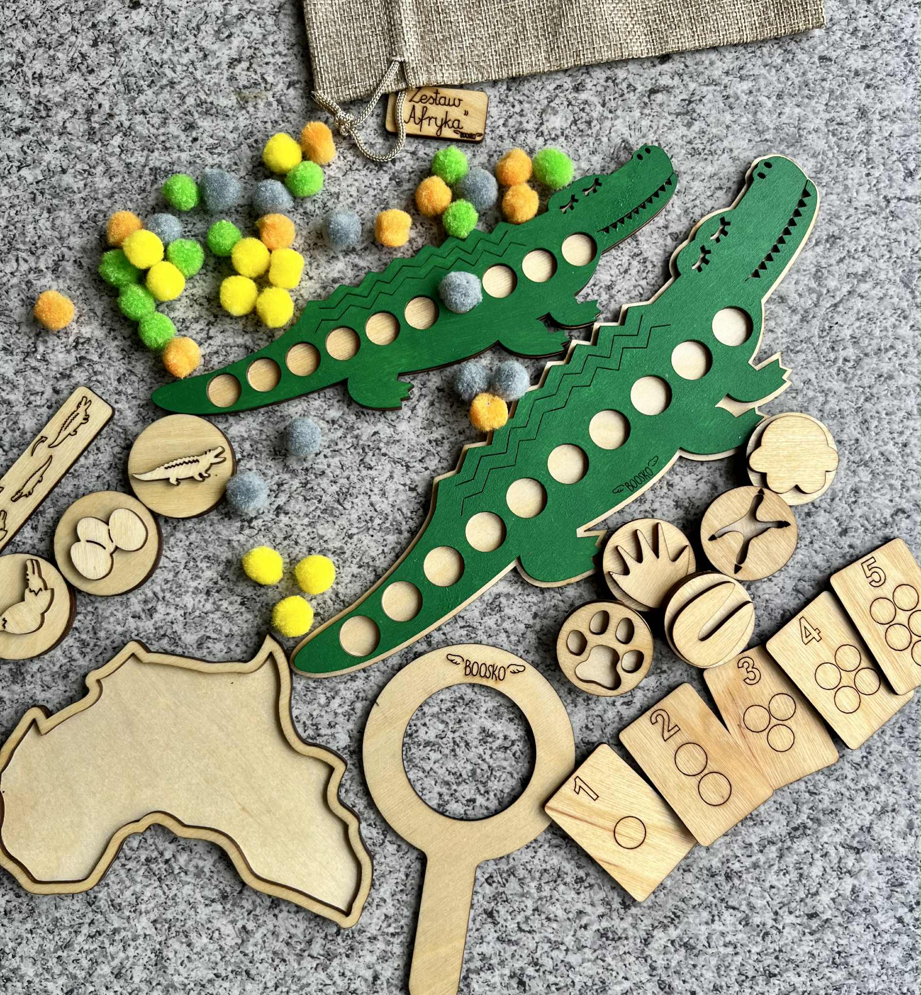 Poznaj wyjątkowy zestaw edukacyjny stworzony z myślą o wspieraniu rozwoju logicznego myślenia, motoryki małej i koordynacji wzrokowo-ruchowej u dzieci. W zestawie znajdziesz dwa drewniane Krokodyle, które kryją w sobie wiele kreatywnych możliwości! ???? Układanka lewopółkulowa – na grzbiecie większego krokodyla znajduje się miejsce do układania pomponów które trzeba ułożyć według wzoru lub koloru ułożonego na małym krokodylu. Zabawa wspiera sekwencjonowanie, analizę wzrokową i koncentrację. ???? Drewniane stemple z motywem tropów zwierzaków mieszkających w Afryce – idealne do zabaw z ciastoliną . Rozwijają sprawność manualną i wyobraźnię.  ???? Dwustronne Kafelki z cyframi 1–10 – można je wykorzystywać do liczenia pomponów, nauki cyfr czy prostych działań matematycznych. ???? ???? Zestaw idealny do zabawy w domu, przedszkolu, terapii oraz zajęć Montessori.