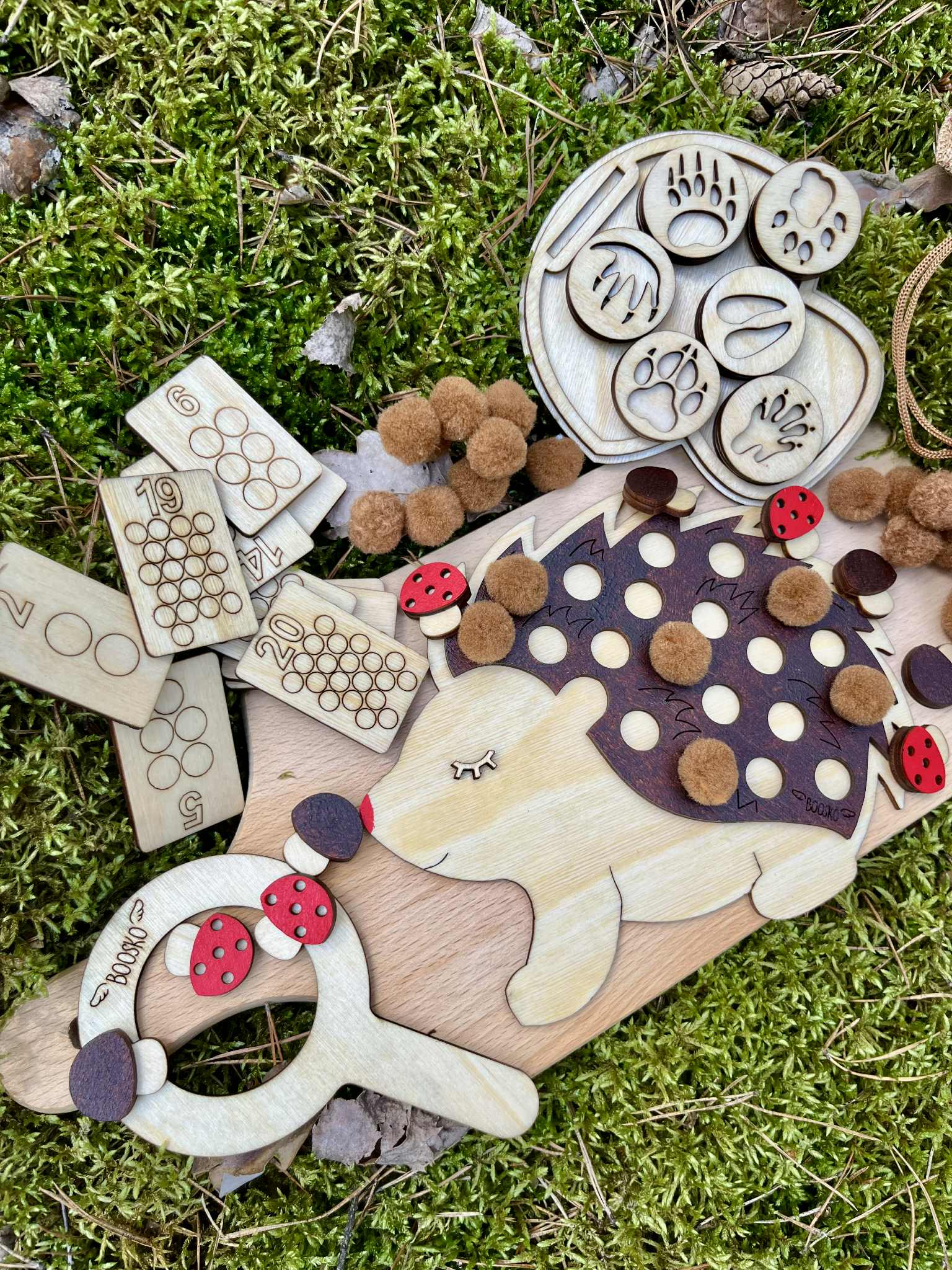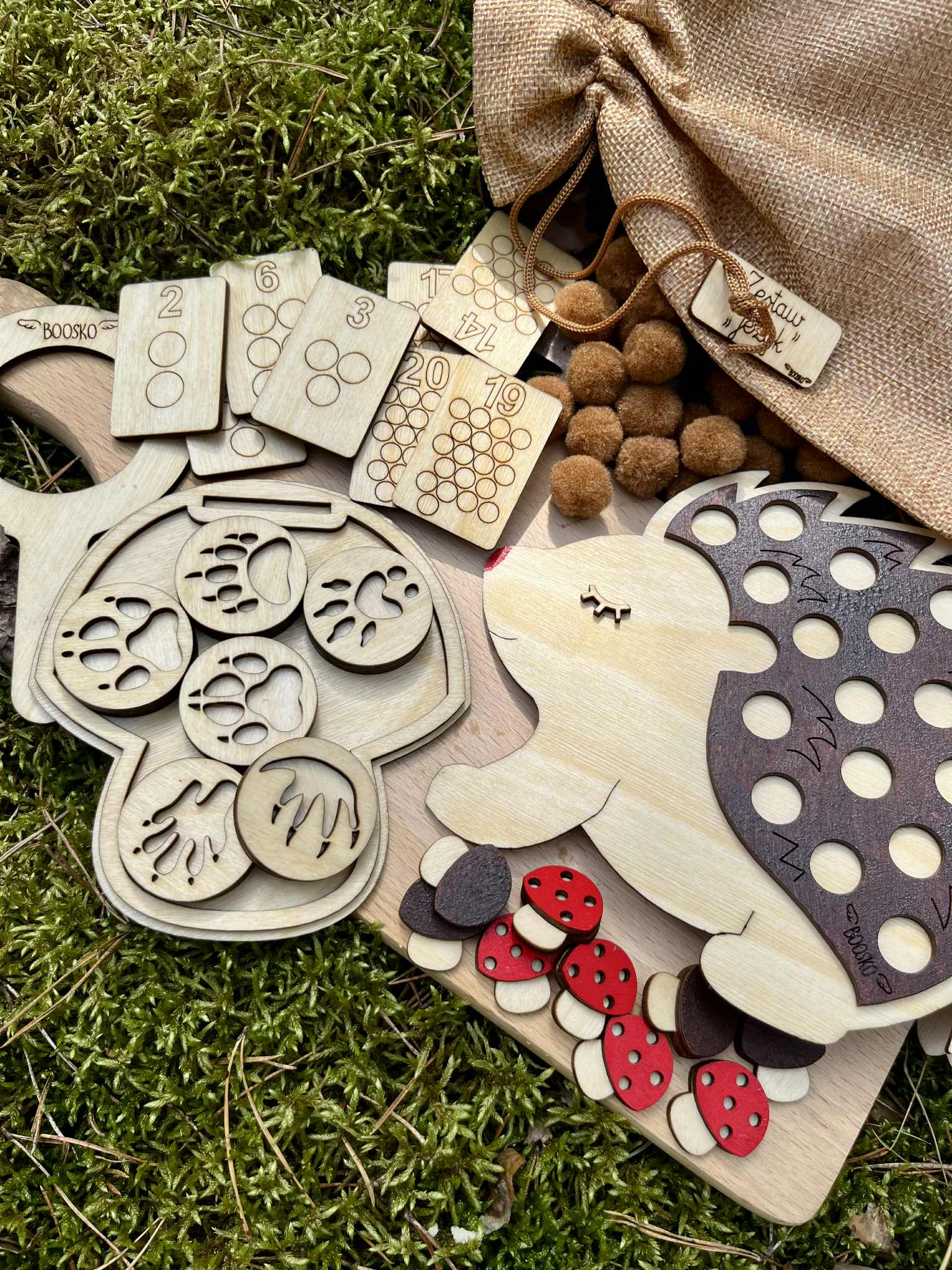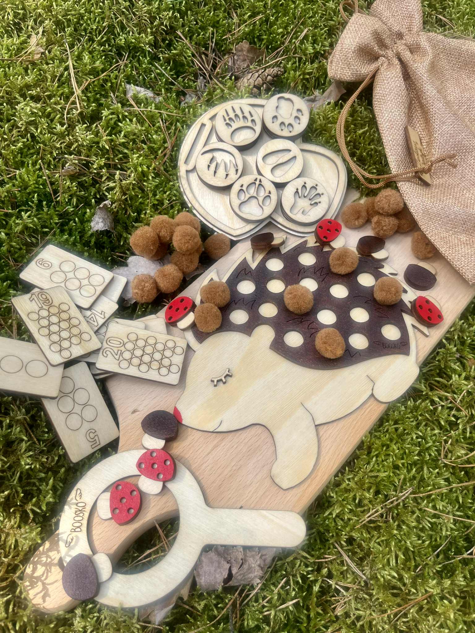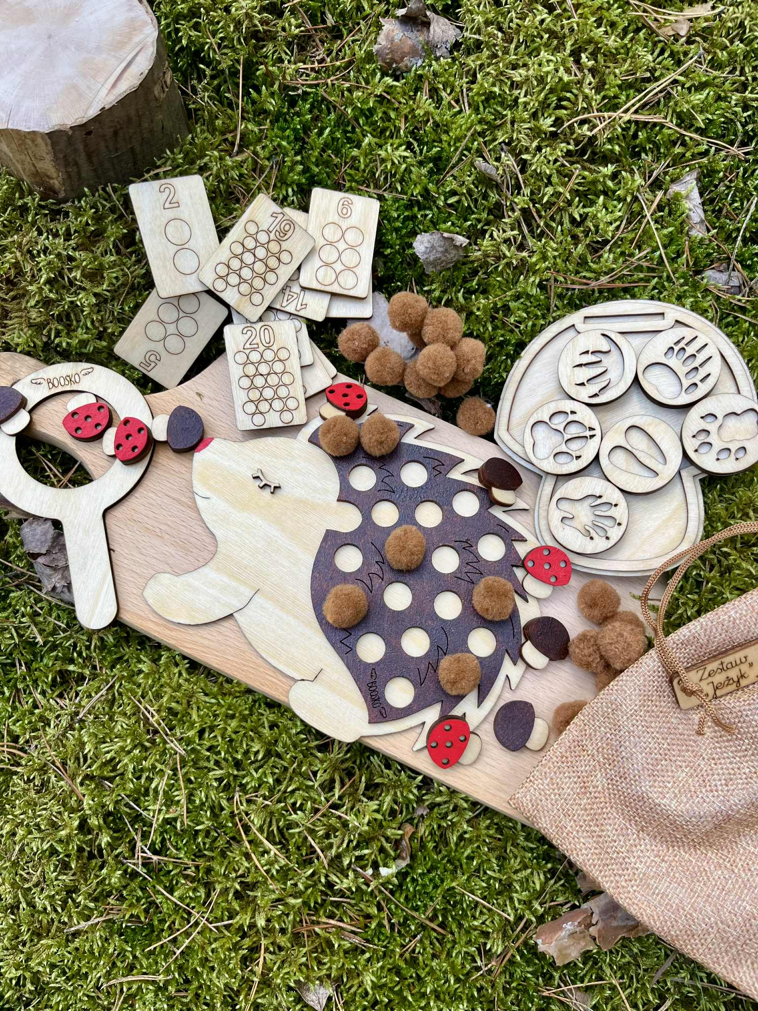 Dziecko ma za zadanie umieścić tyle brązowych pomponów na jeżyku żeby ich ilość opowiadała liczbie na drewnianej karcie ( karty są dwustronne, zakres 1-20) . Do zestawu dołączonych jest 6 dwustronnych drewnianych stempli  z tropami zwierząt. Stemple świetnie odbijają się w ciastolinie i piasku kinetycznym. W zestawie znajdziecie grę - odpowiednik gry "kółko i krzyżyk". Edukacja poprzez zabawę.