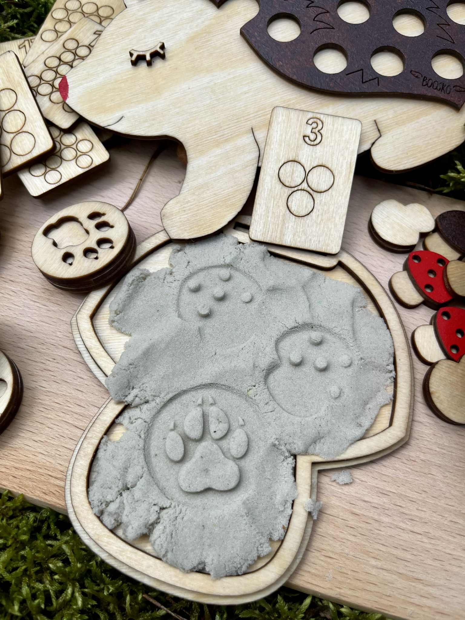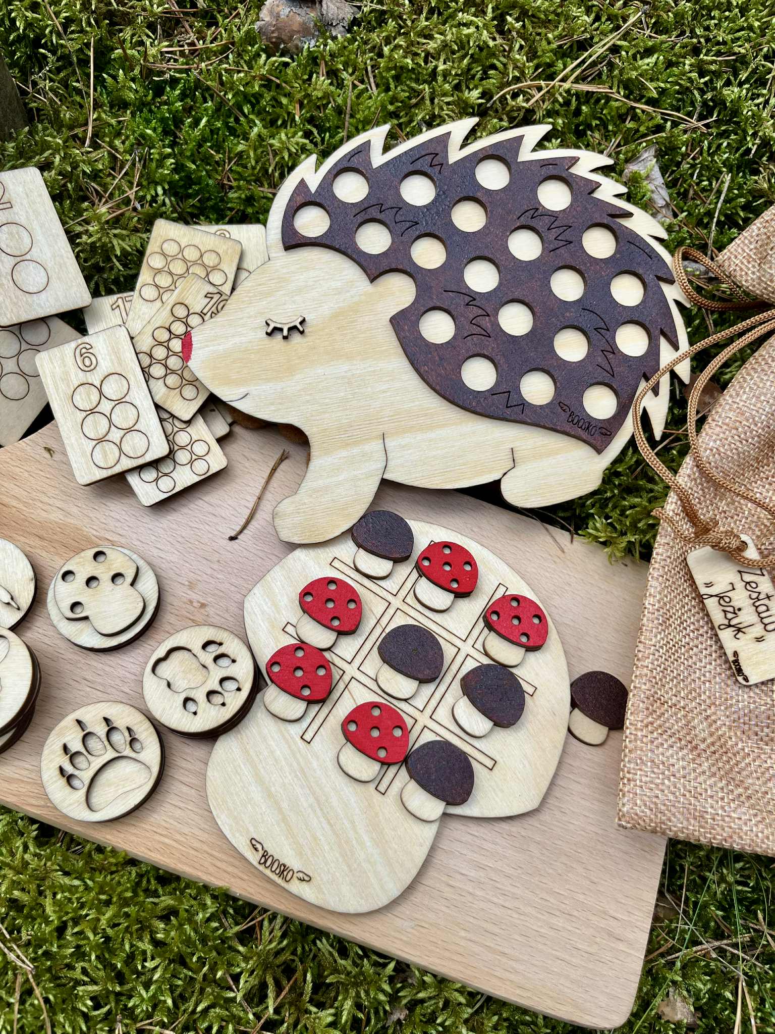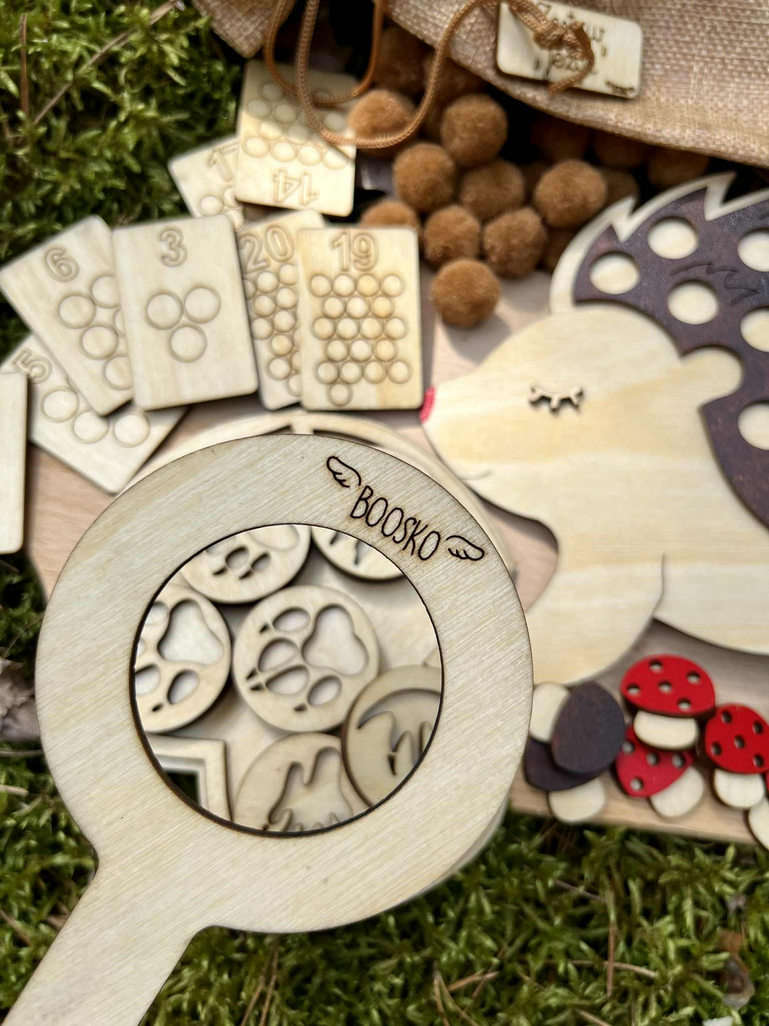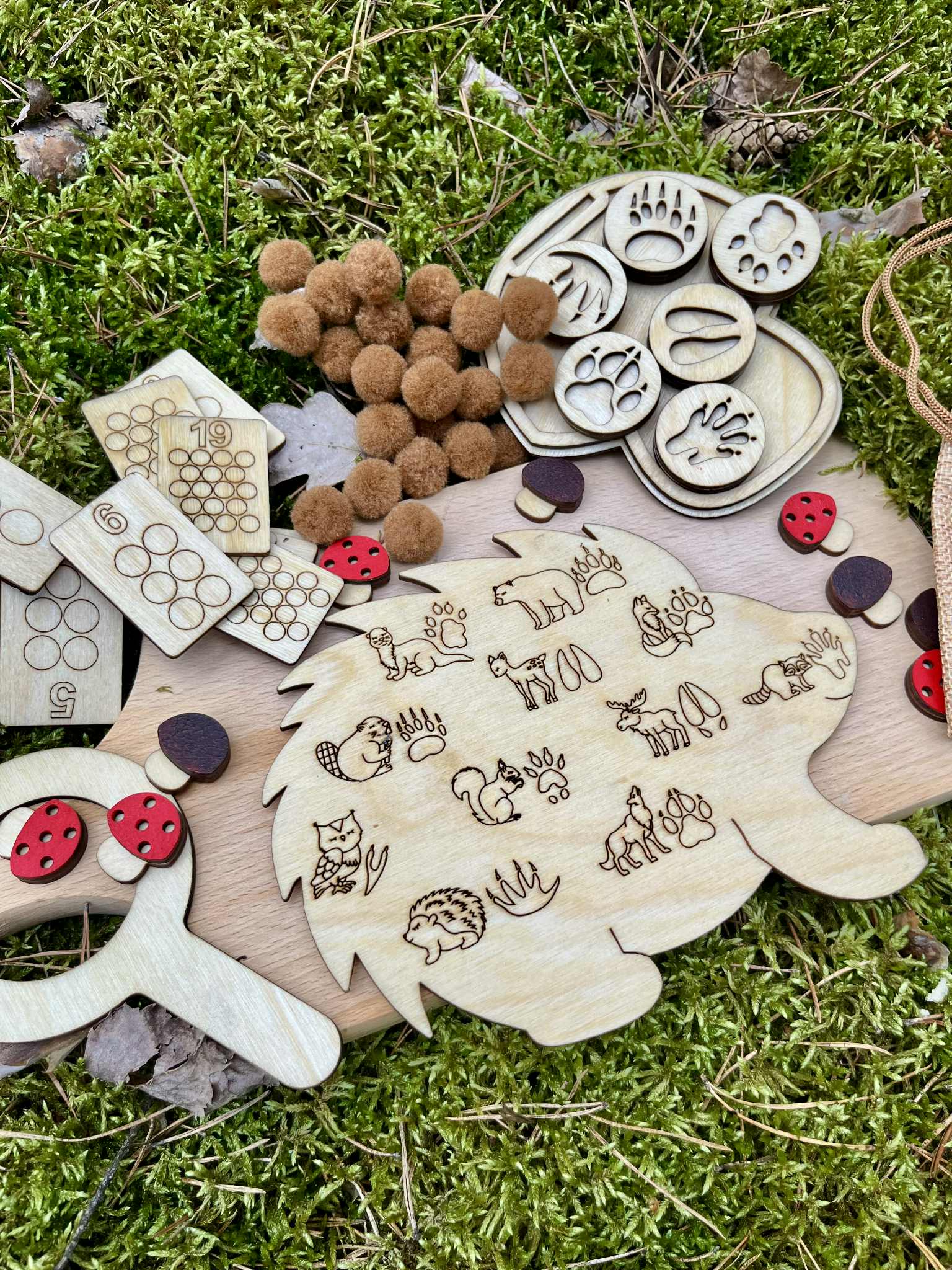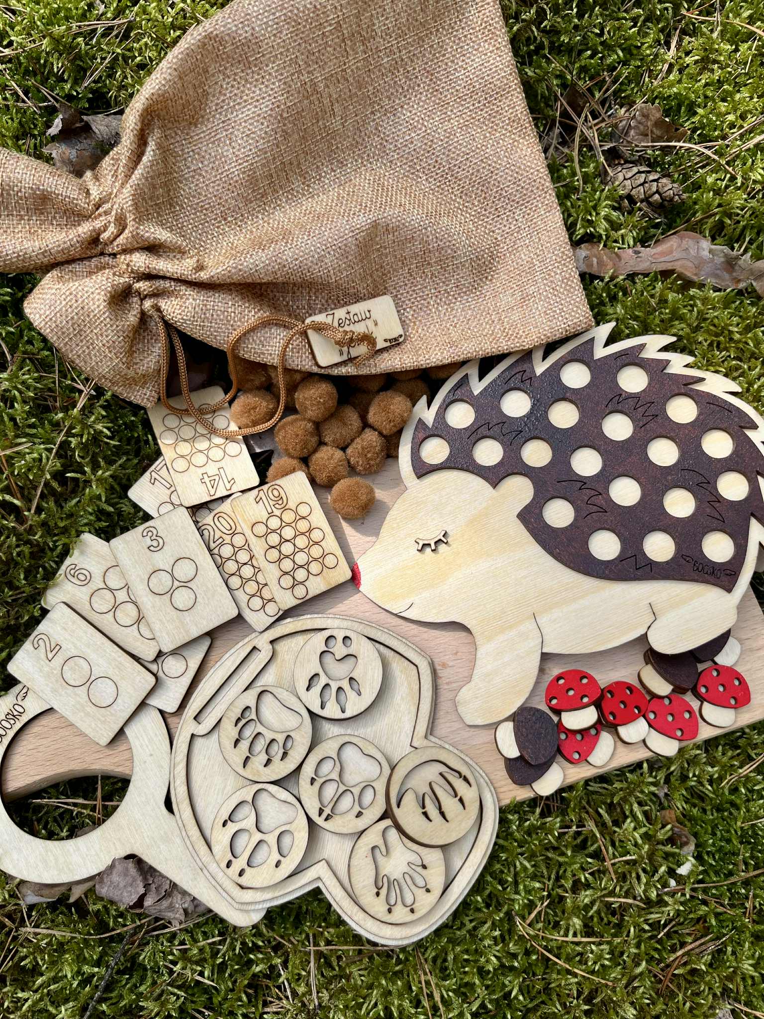 Dziecko ma za zadanie umieścić tyle brązowych pomponów na jeżyku żeby ich ilość opowiadała liczbie na drewnianej karcie ( karty są dwustronne, zakres 1-20) . Do zestawu dołączonych jest 6 dwustronnych drewnianych stempli  z tropami zwierząt. Stemple świetnie odbijają się w ciastolinie i piasku kinetycznym. W zestawie znajdziecie grę - odpowiednik gry "kółko i krzyżyk". Edukacja poprzez zabawę.